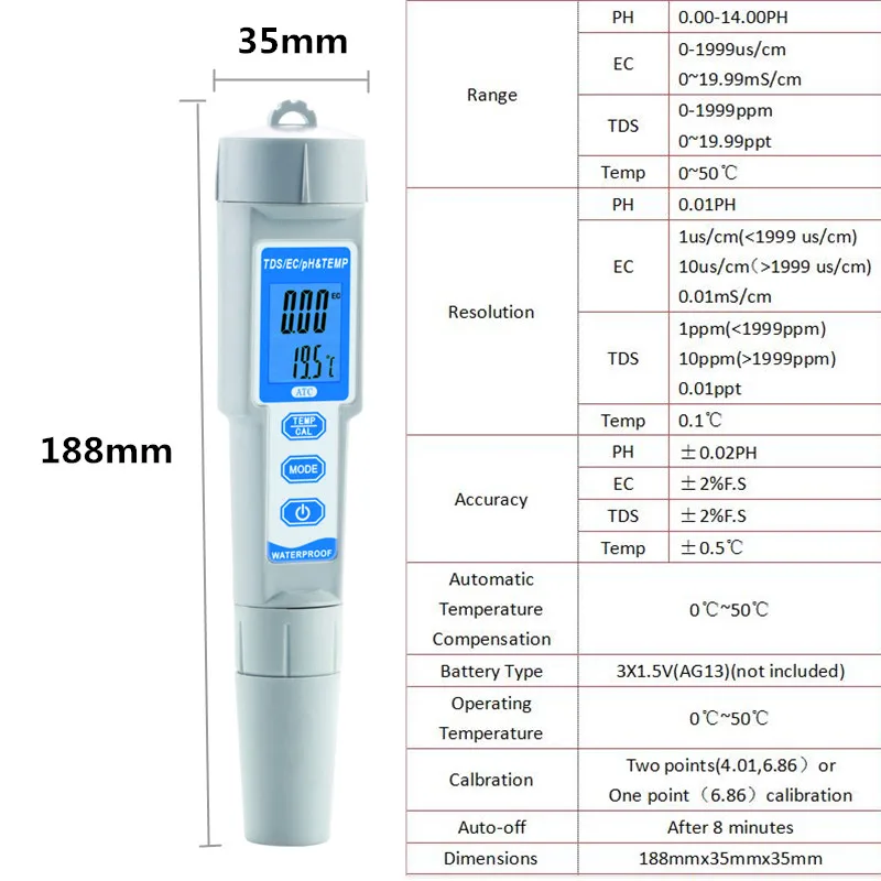 Измеритель температуры 4 в 1, TDSPHECPH-3508, с подсветкой, водонепроницаемый, цифровой тестер качества воды, скидка 48%