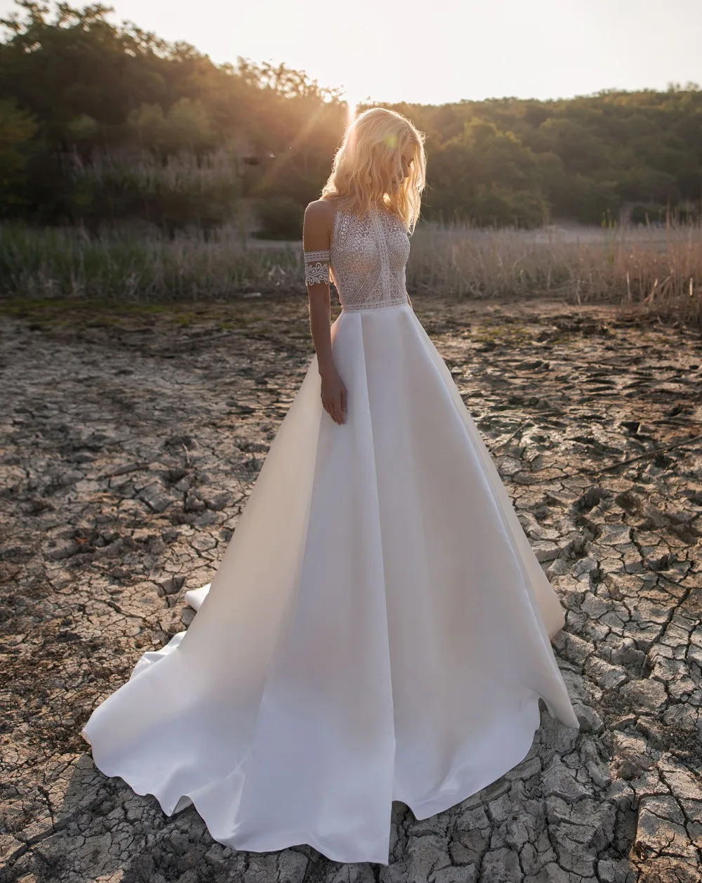 Подвенечное кружевное атласное богемское платье на пуговицах и А-образным вырезом спины нового дизайна