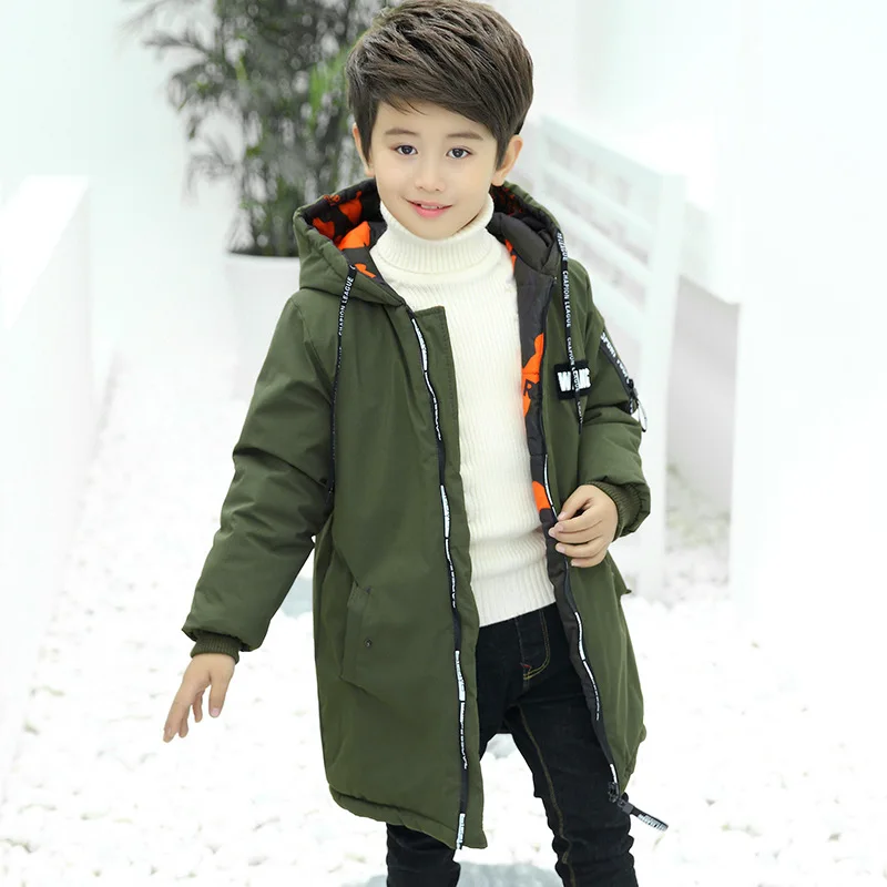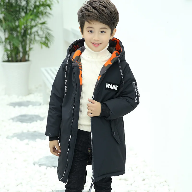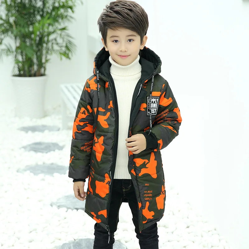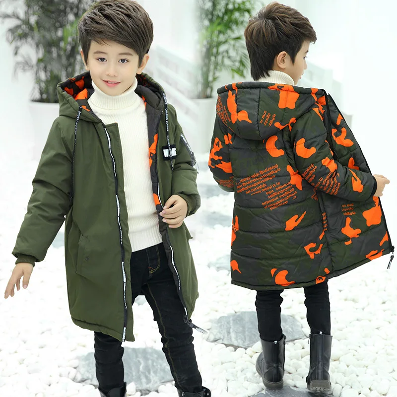 Две стороны носить Мальчики Зимняя камуфляжная верхняя одежда, длинное пальто для детей с эмблемой одежда на молнии парки парка зимний костюм на каждый день