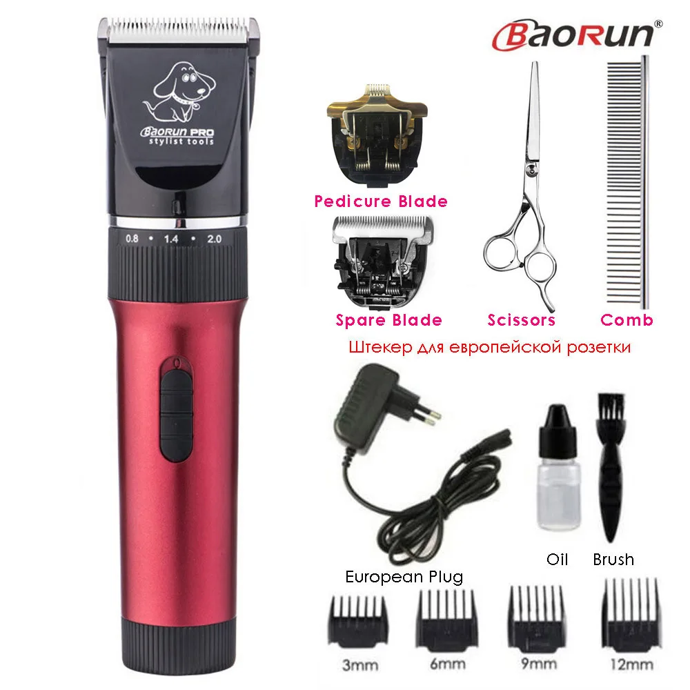 Описание продукта: Тип изделия: триммер для волос для домашних животных Фирменное наименование: BaoRun Цвет: кофейный, красный Материал: АБС-пластик и сталь Модель: P6 Напряжение: 110-240 В Время зарядки: 3-5 часов Перезаряжаемая батарея: литиевый тип, 2000 мАч Длина кабеля питания: около 175см Использование: уход за животными Лезвие: керамическое и титановое покрытие Двигатель: 3,7 V, высокая Мощность Прецизионная регулируемая ручка: 0,8 мм-2 мм Гребень для бритья: 3 мм, 6 мм, 9 мм, 12 мм Время работы: до 6 часов Адаптер питания: DC5V,1000mA Двойное использование: хорошо работает как от электрической сети, так и от аккумулятора. Когда аккумулятор не работает, вы можете сохранить процесс обрезки, вставив машинку (подключив адаптер питания к сети электроснабжения).