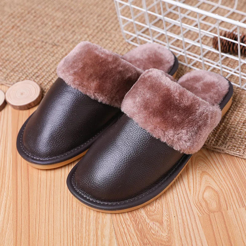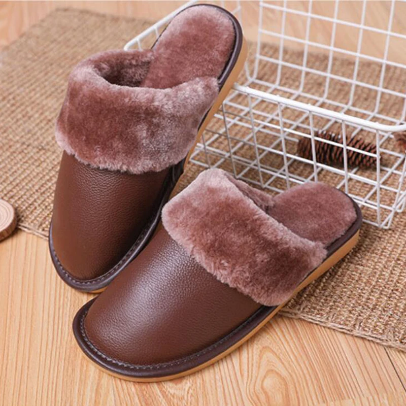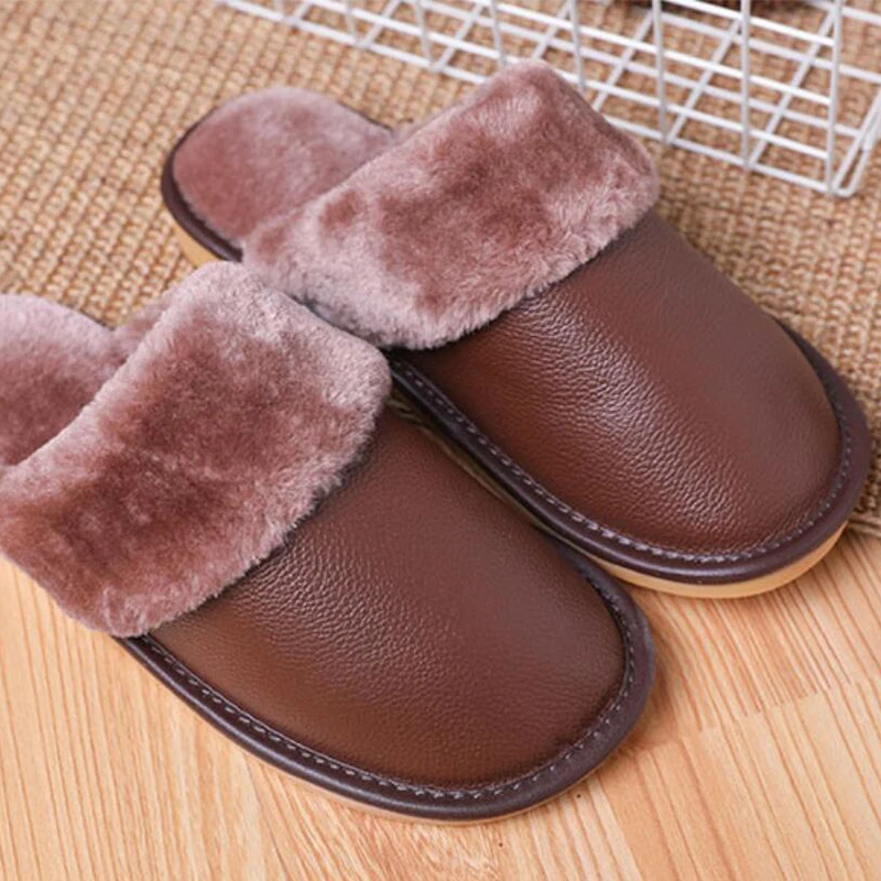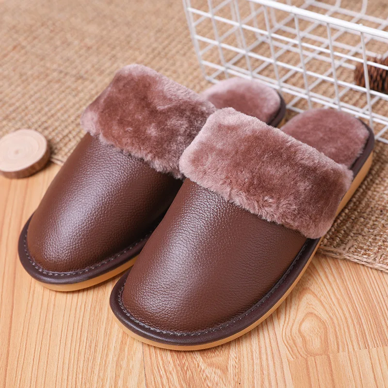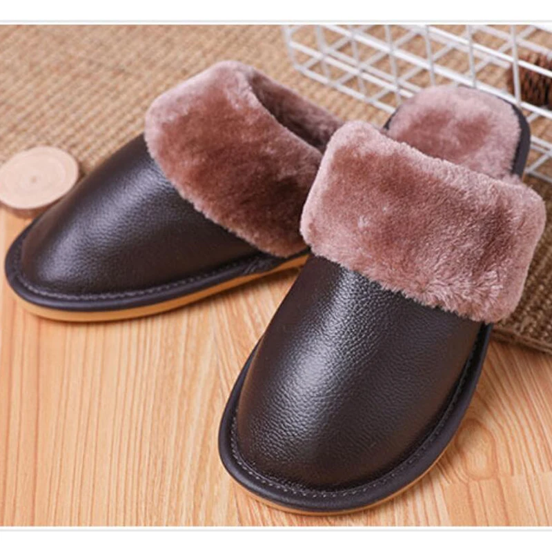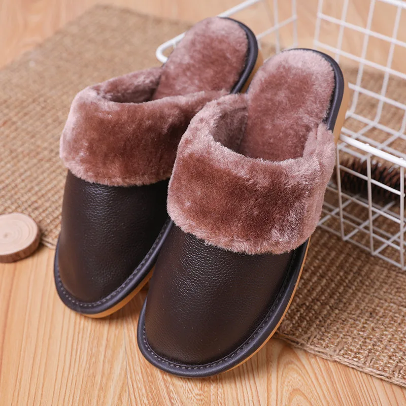 Тапочки мужские кожаные, на платформе, зимние, водонепроницаемые, с искусственным мехом