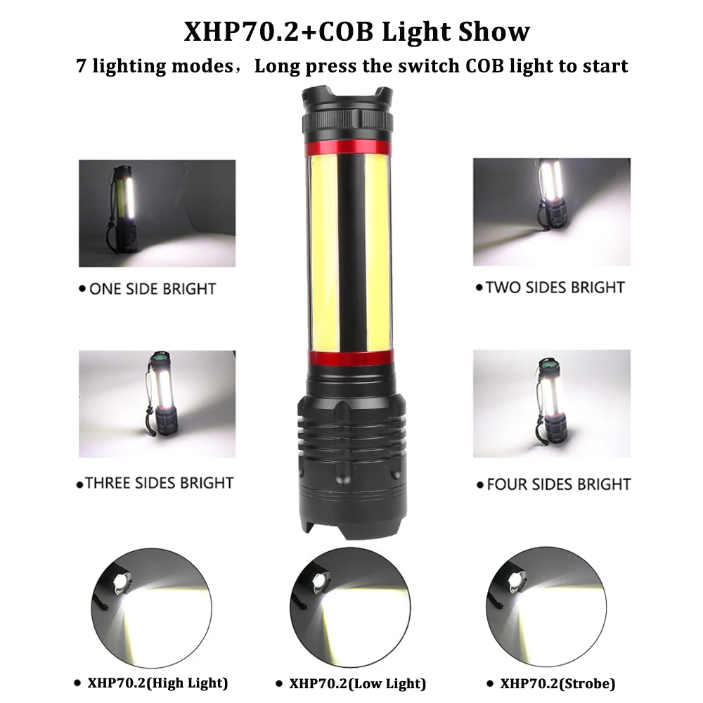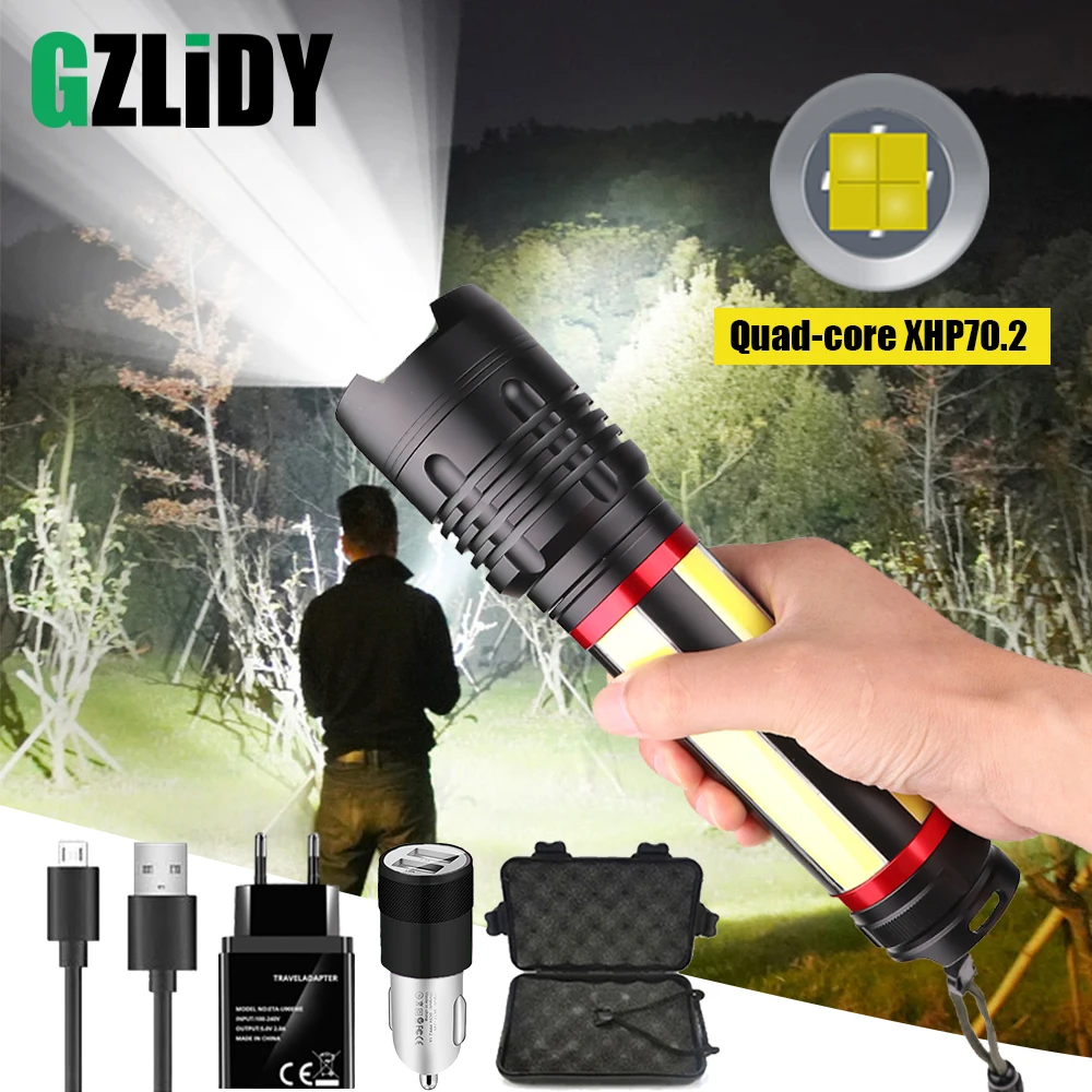 Суперъяркий светодиодный фонарь XHP70.2 + COB, тактический Водонепроницаемый фонарь с фокусировкой, посветильник фсветильник рь с функцией USB входа и выхода