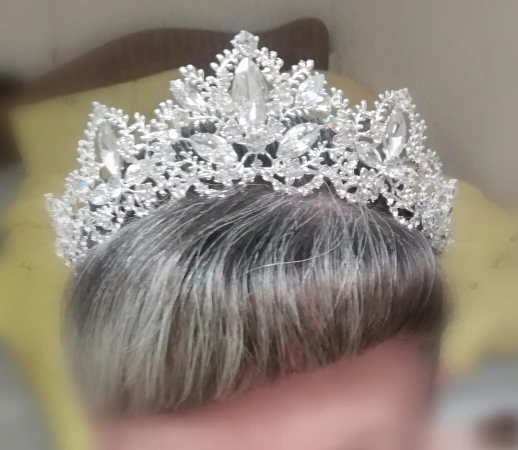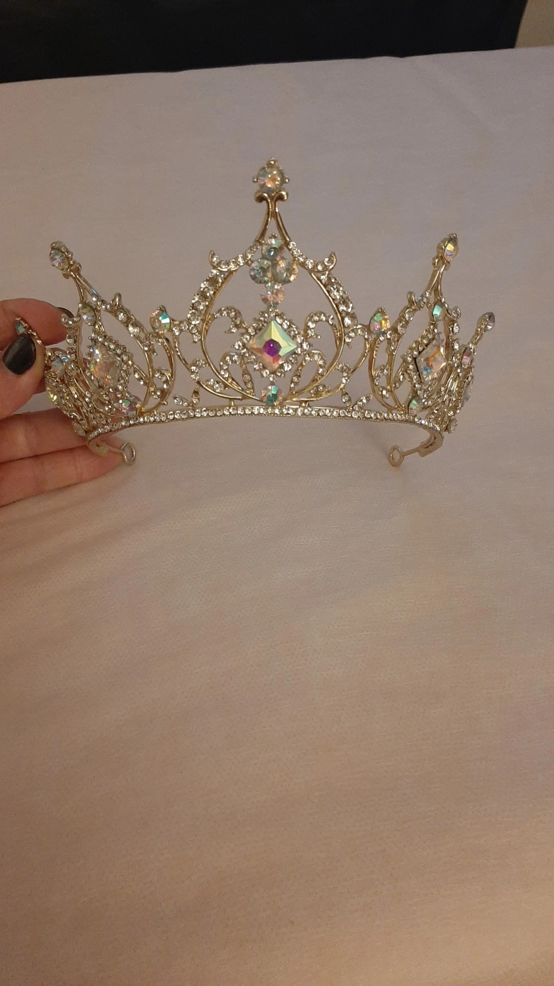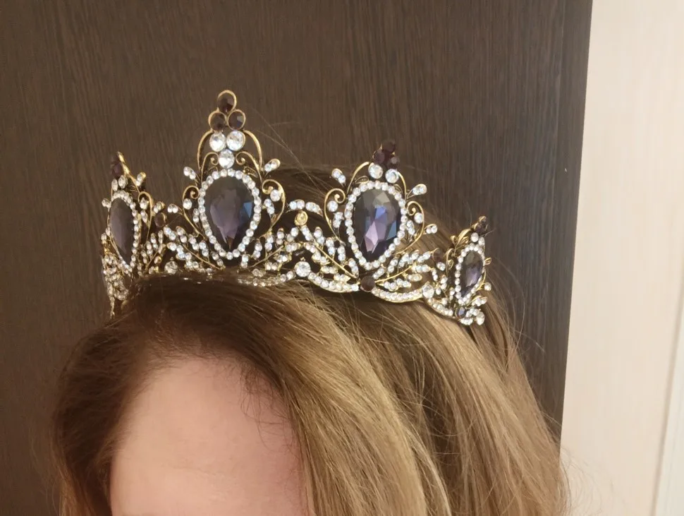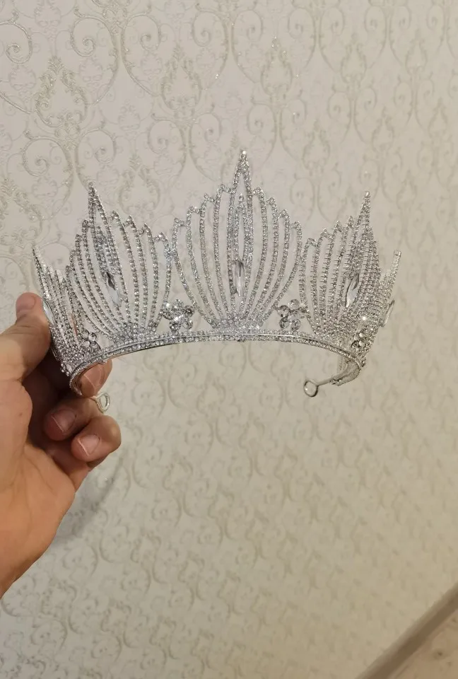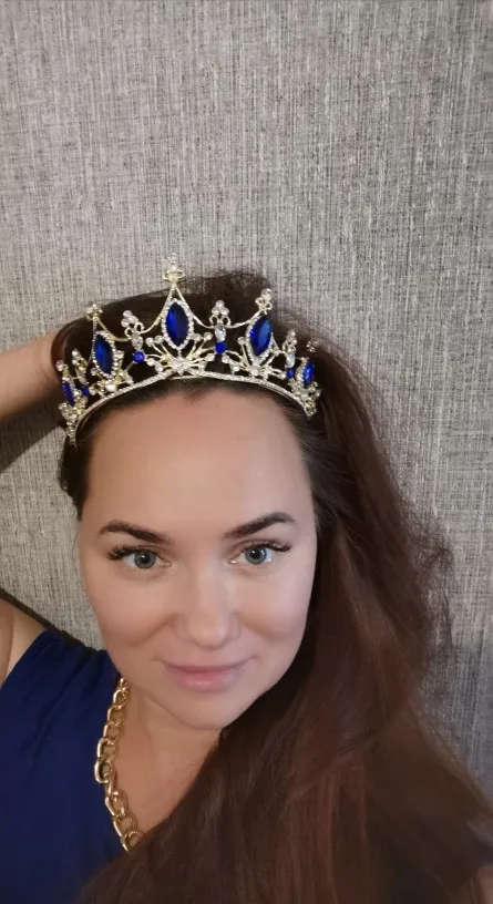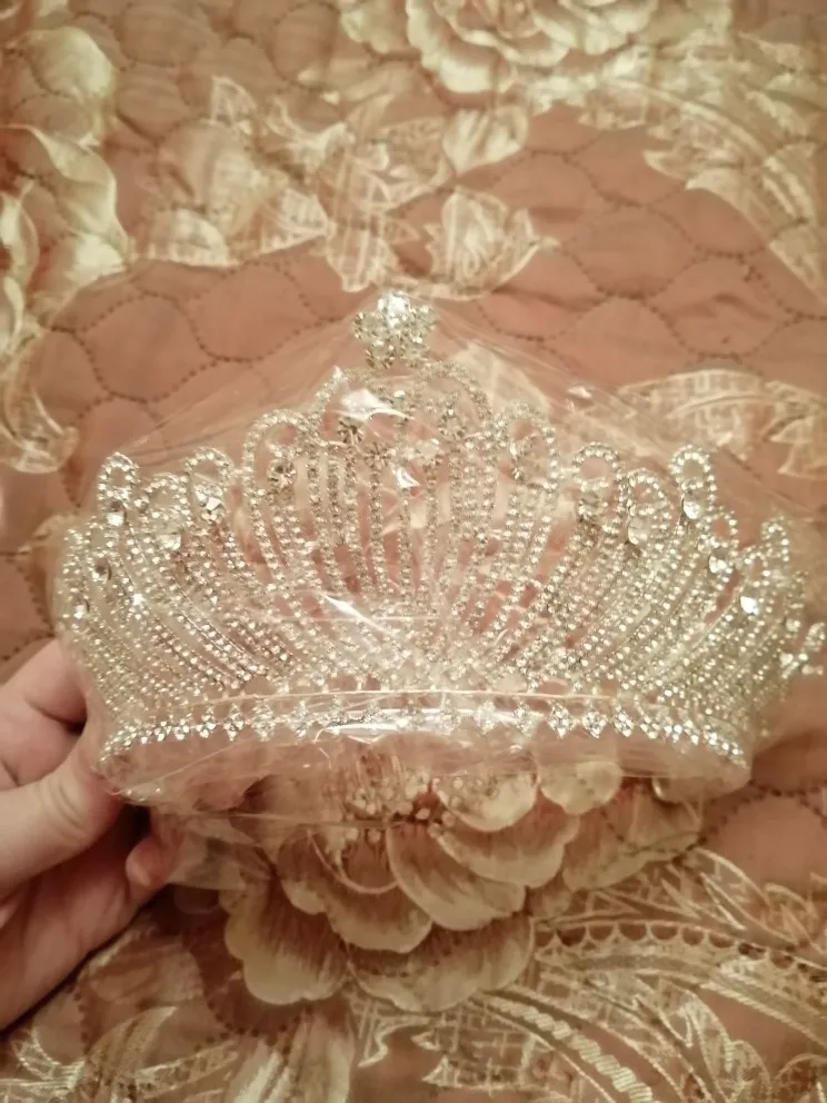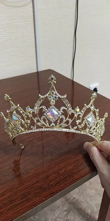 Шикарная корона, металлическая, даже лучше, чем на фото. На голове держится крепко, камни и стразы надежно приклеены