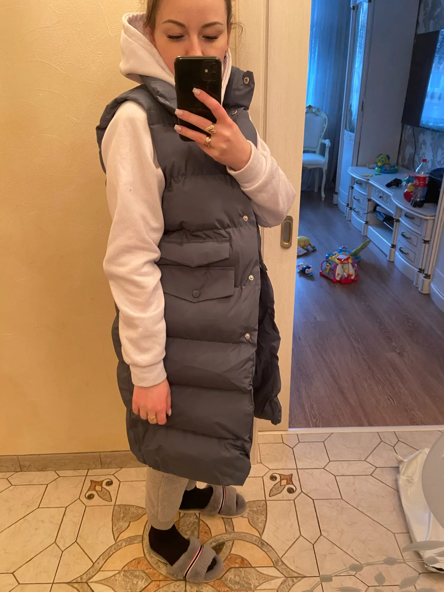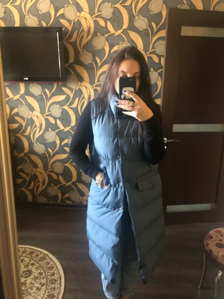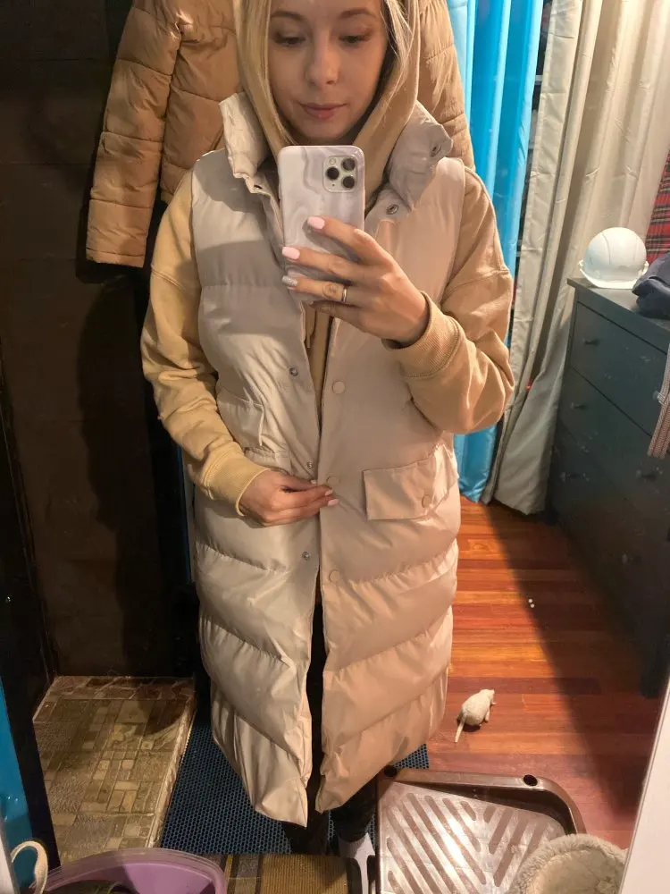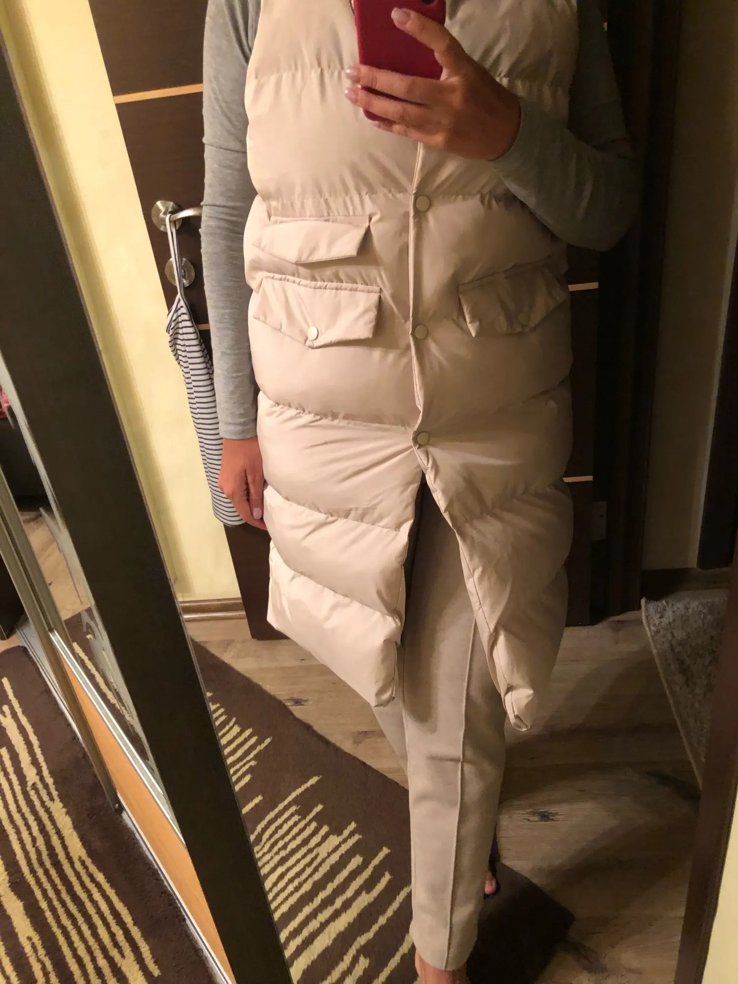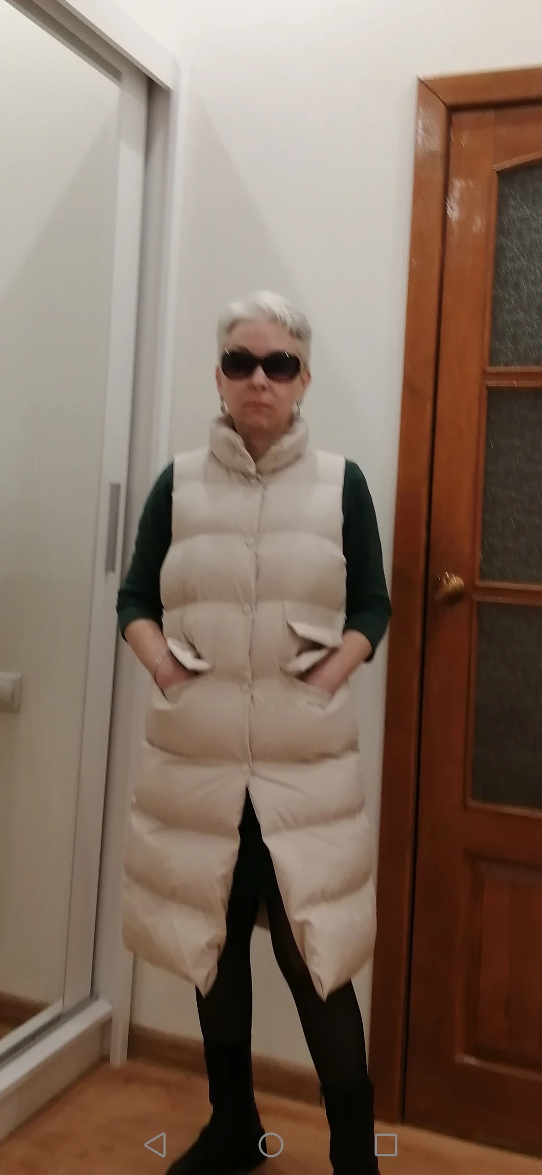 Супер стильный, теплый пуховик-жилетка! Я в полном восторге! Даже в +-5 градусов в нем будет тепло. Только чтобы руки не мёрзли, нужно надевать свитер потеплее. Супер! И заказ пришёл очень быстро (где-то до двух недель). Мой рост 158см.