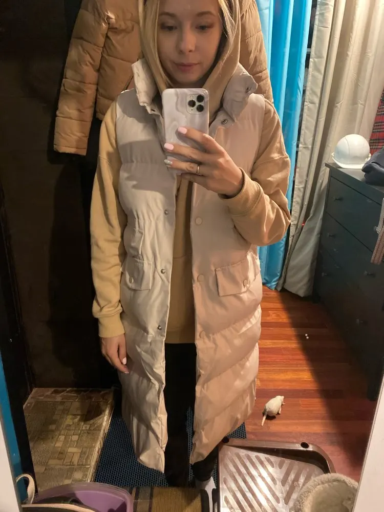 Сделала заказ 21 сентября, получила 1 октября, очень быстро. Жилет отличный, торчало пару ниток, но это не беда) Запах новой вещи. Строчки ровные, наполнение равномерное, фурнитура хорошая. Пришёл практически не мятый, сразу сфоткала. Брала размер М на 84-65-95 (рост 165) с расчетом на то, что под него буду носить объёмные свитеры/худи. Ткань немного шуршит, совсем чуть-чуть. Цвет на фото немного светлее, чем на самом деле. В реальности - светло бнжевый. Продавец положил в подарок резинку для волос) Продавцу спасибо, к покупке рекомендую.
