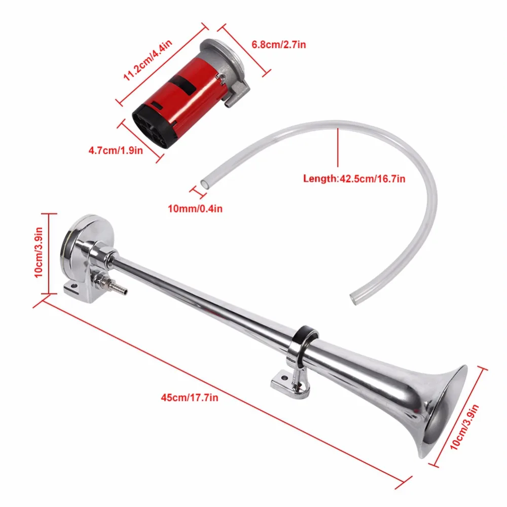 Описание: Этот однотрубный воздушный рожок изготовлен из хромированного цинка, который может обеспечить максимальную прочность и долговечность для длительного использования; И предназначен для устойчивости к погодным условиям. Он может издавать громкий мощный настроенный звук поезда. Он может производить звук как громкий, как 150 дБ. Большой громкий звук привлекает всеобщее внимание и слышен по всему миру. Особенности:
