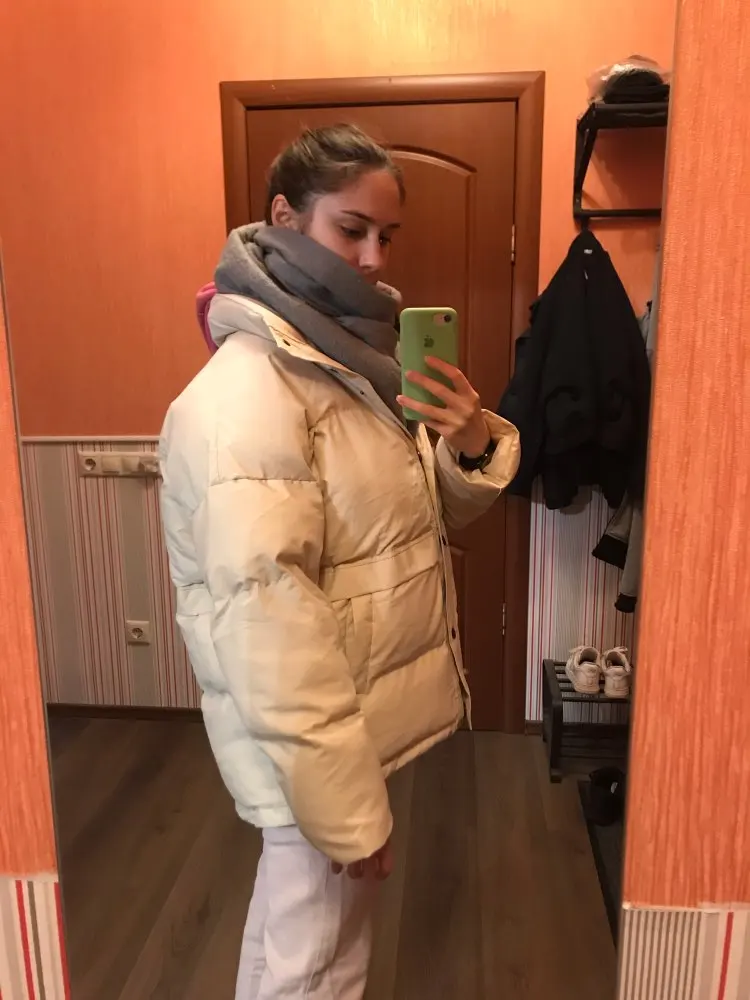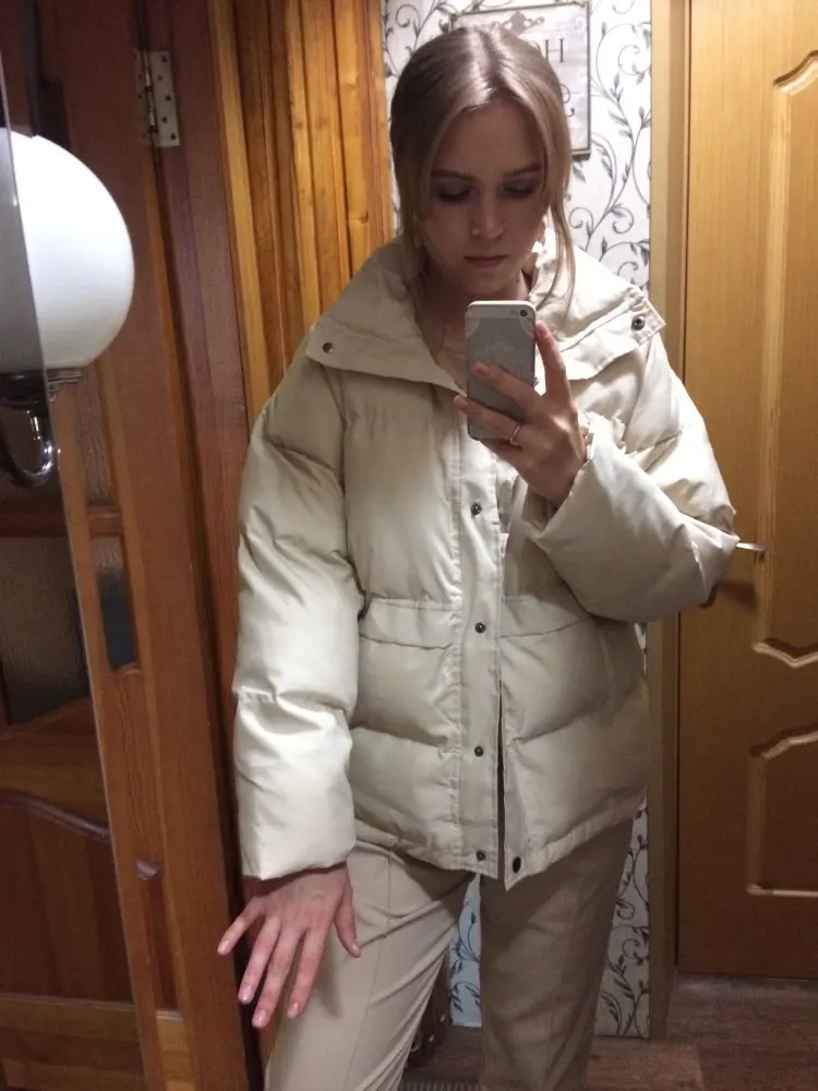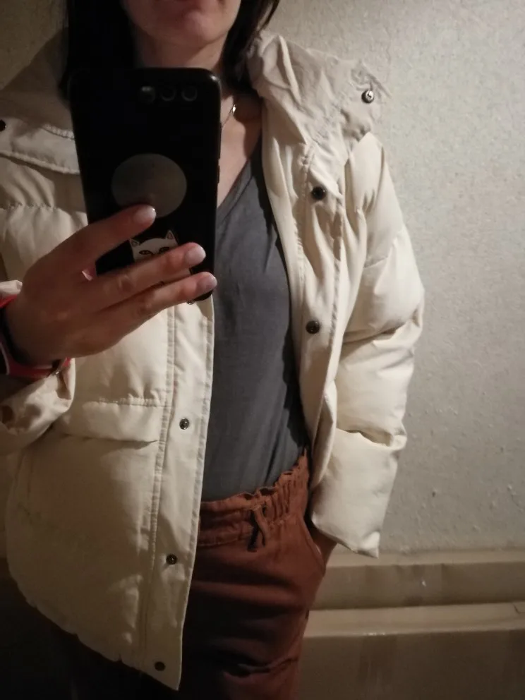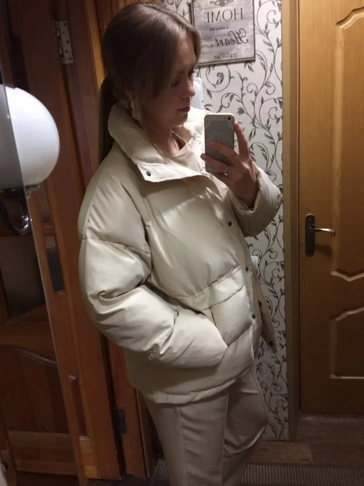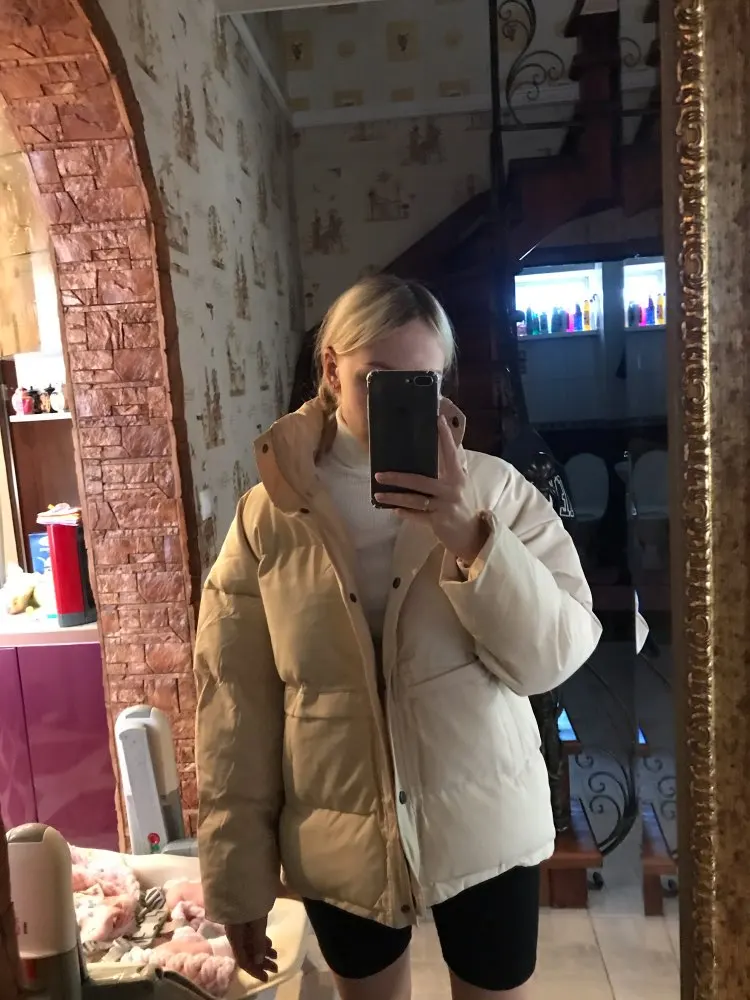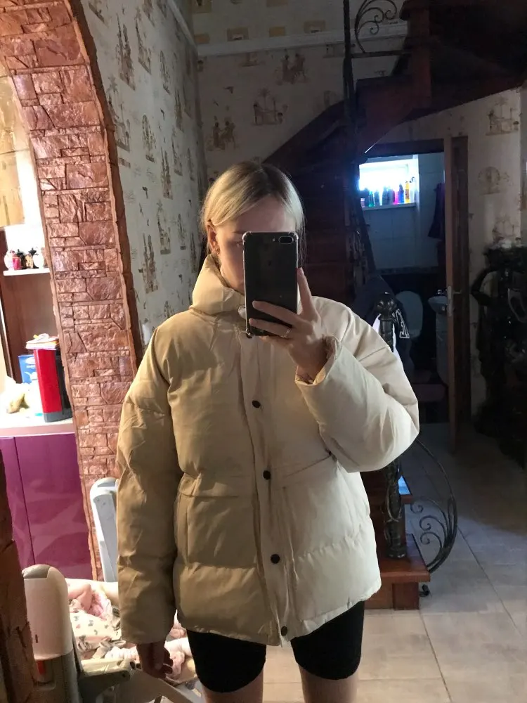 Как и у многих других покупателей сложилось мнение, что можно было брать размер s, так как куртка кажется очень свободной. Но это личные ощущения — со стороны выглядит как правильный оверсайз. При 0 градусов и сильном ветре было очень тепло и комфортно. Цвет удачный: светлый и красивый, но не белый, так что не особо пачкается. Короче, покупкой очень довольна