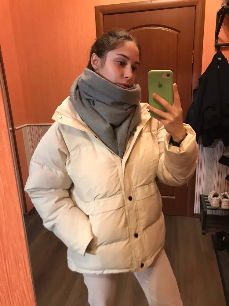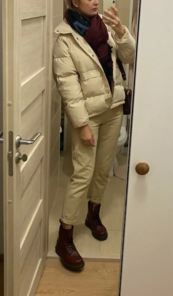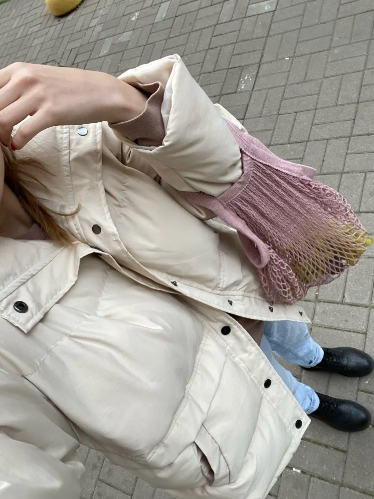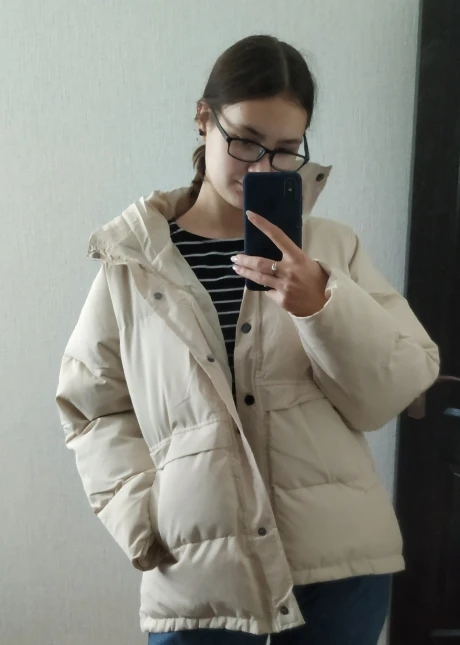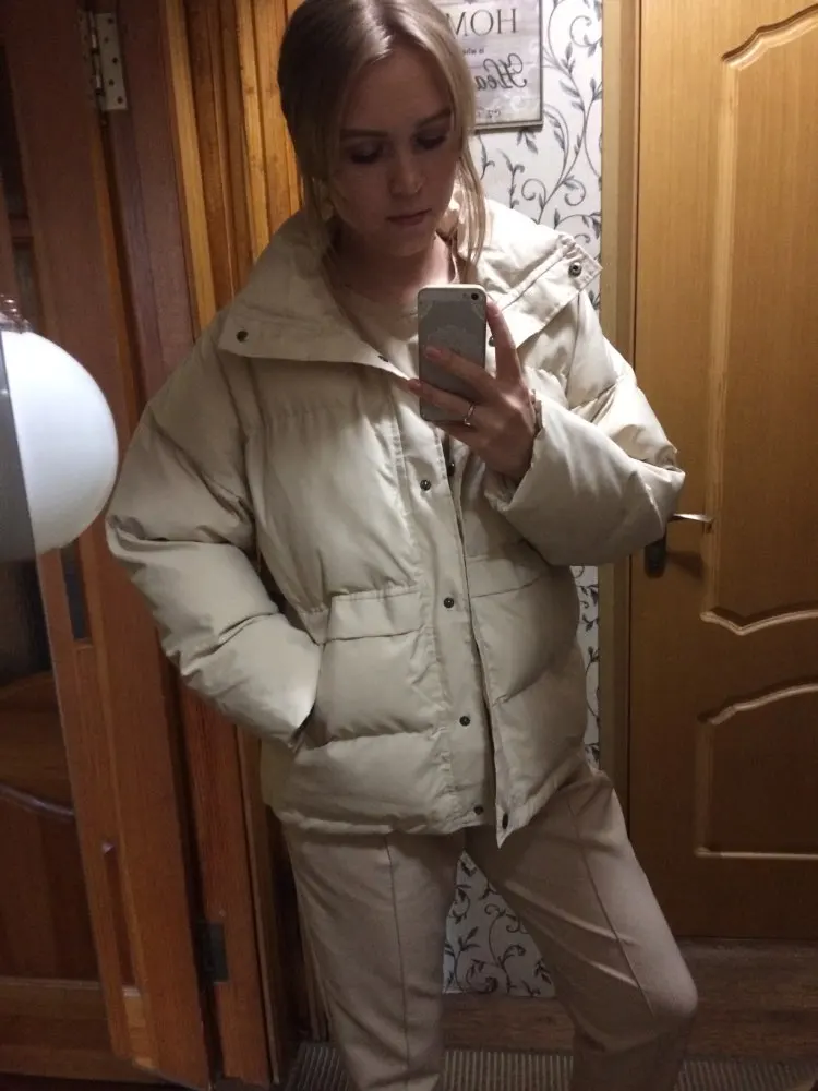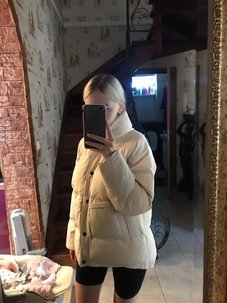Как и у многих других покупателей сложилось мнение, что можно было брать размер s, так как куртка кажется очень свободной. Но это личные ощущения — со стороны выглядит как правильный оверсайз. При 0 градусов и сильном ветре было очень тепло и комфортно. Цвет удачный: светлый и красивый, но не белый, так что не особо пачкается. Короче, покупкой очень довольна