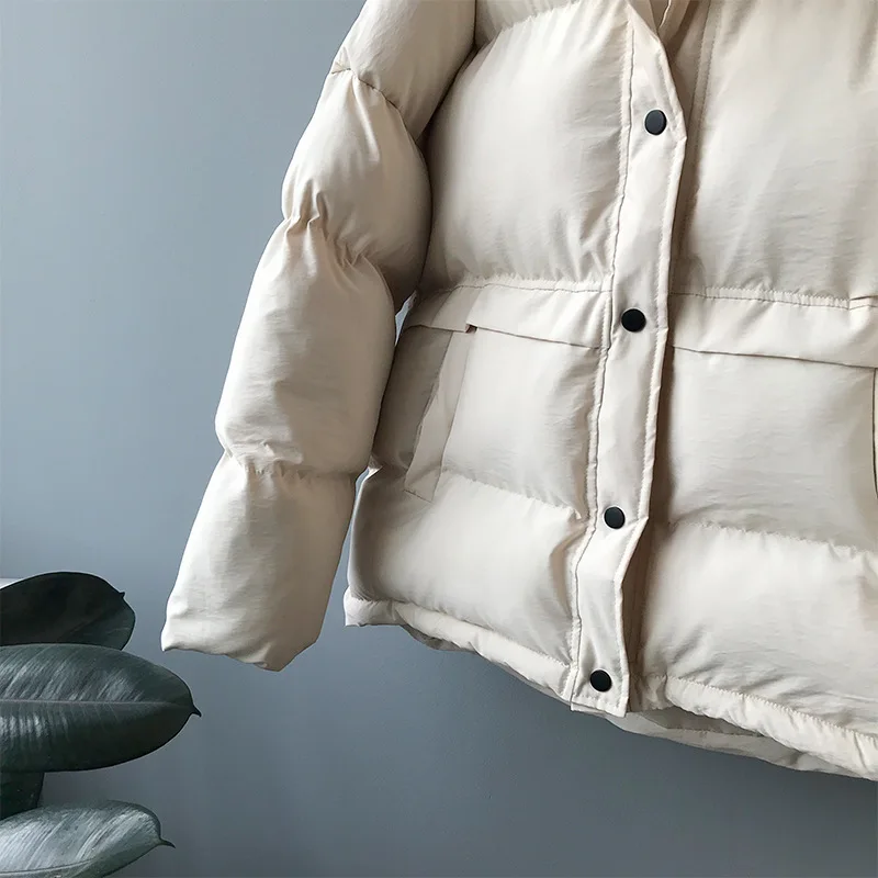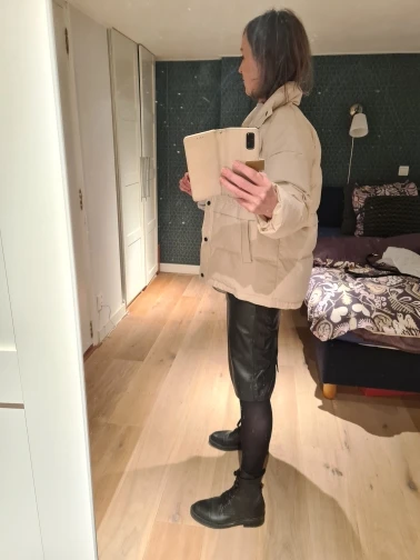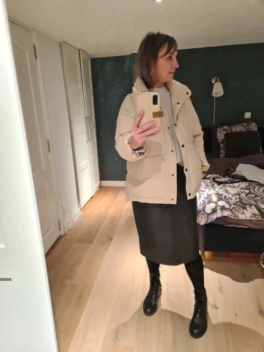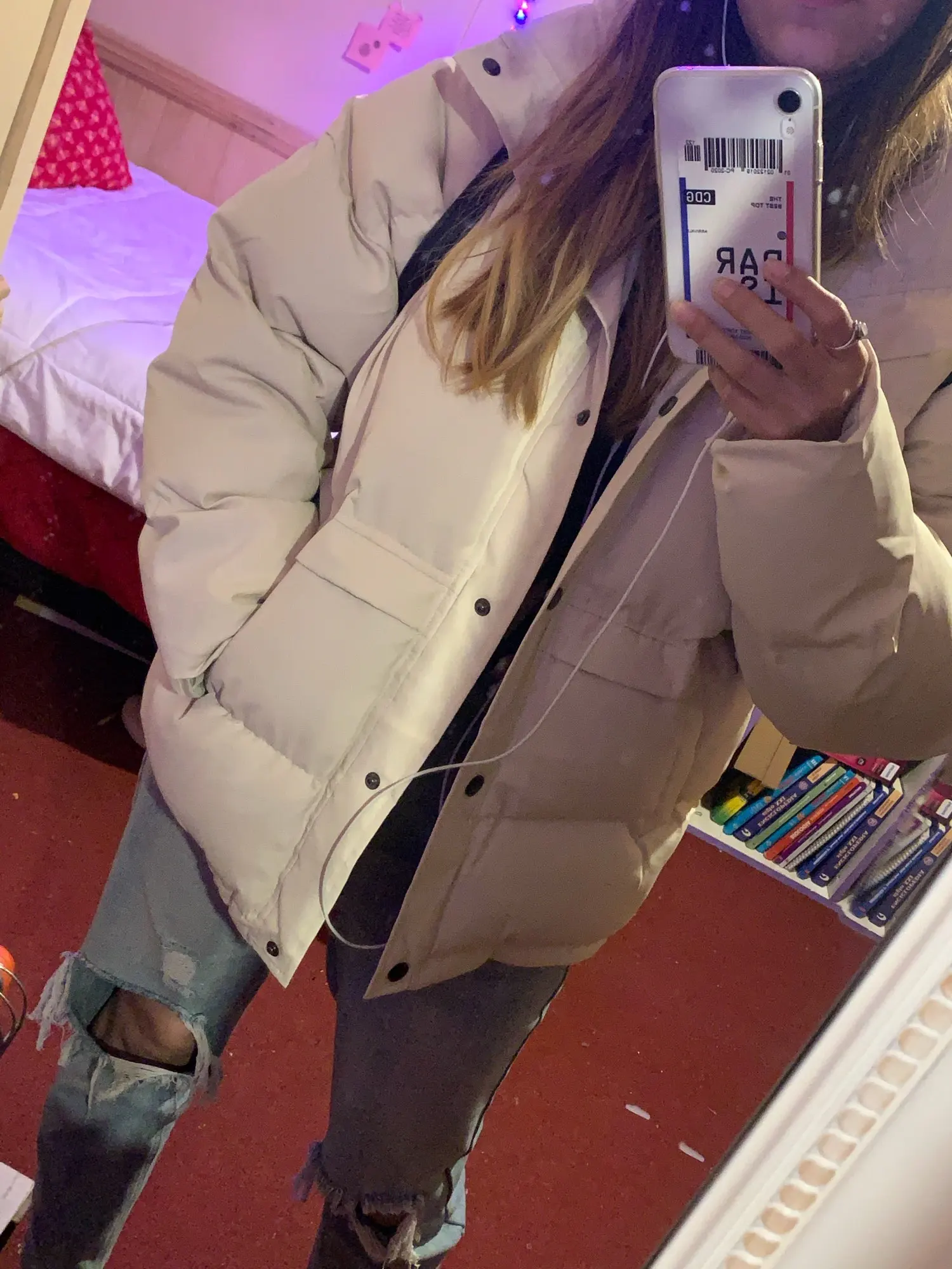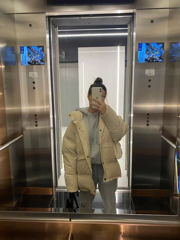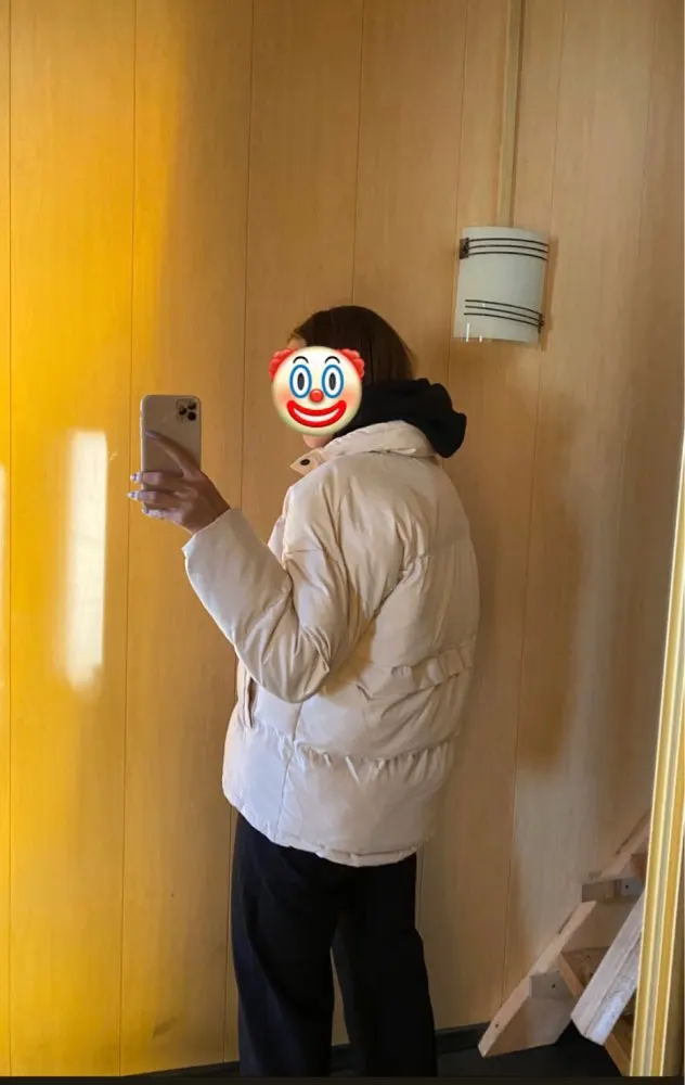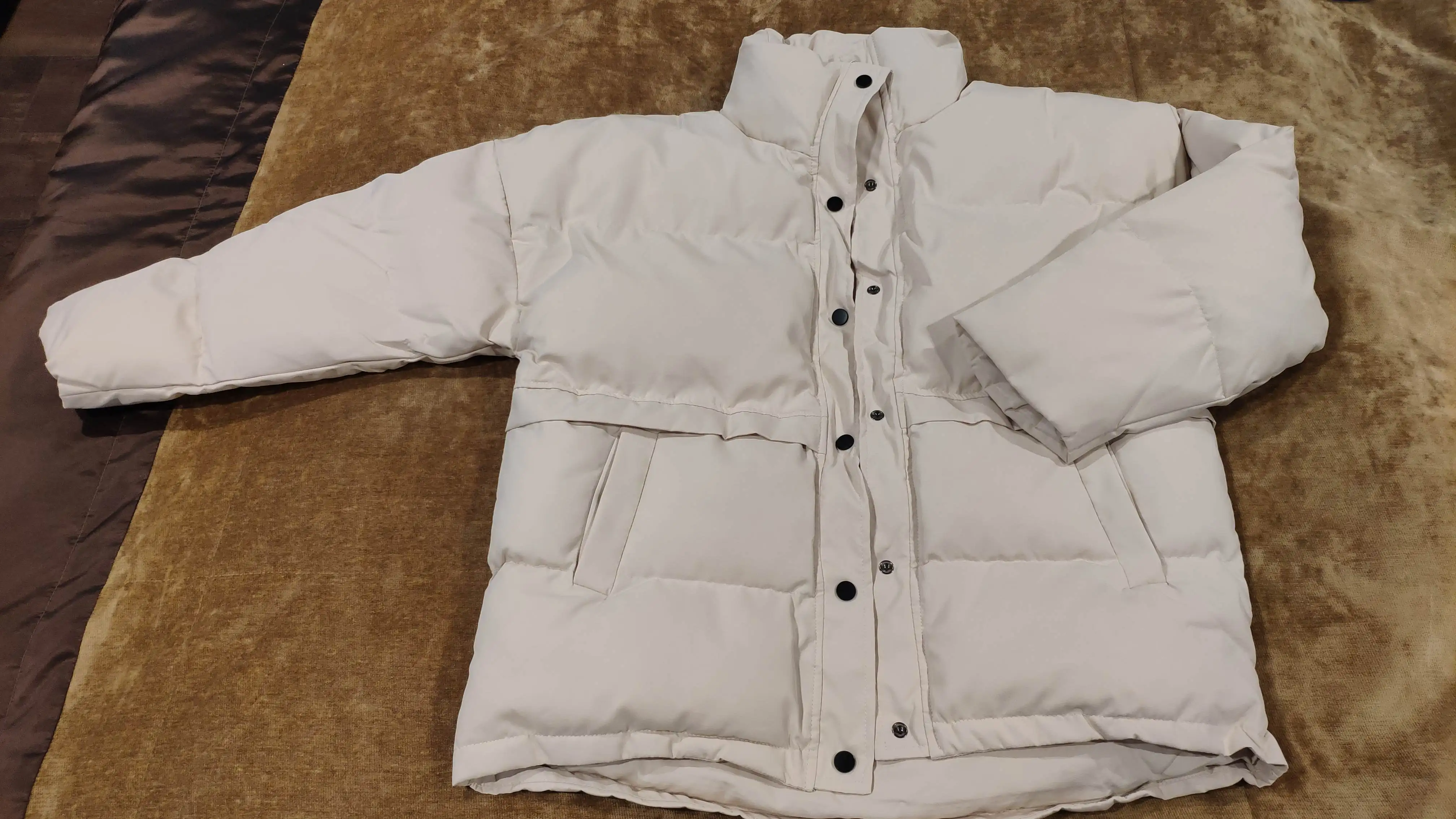 Как и у многих других покупателей сложилось мнение, что можно было брать размер s, так как куртка кажется очень свободной. Но это личные ощущения — со стороны выглядит как правильный оверсайз. При 0 градусов и сильном ветре было очень тепло и комфортно. Цвет удачный: светлый и красивый, но не белый, так что не особо пачкается. Короче, покупкой очень довольна