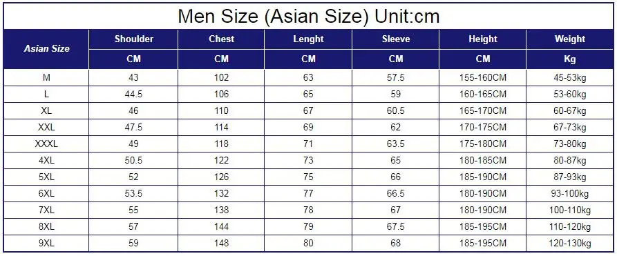 Men Size (Asian Size) Unit:cm