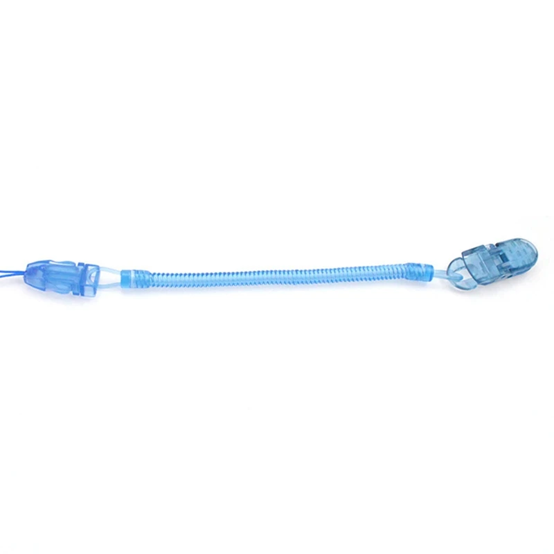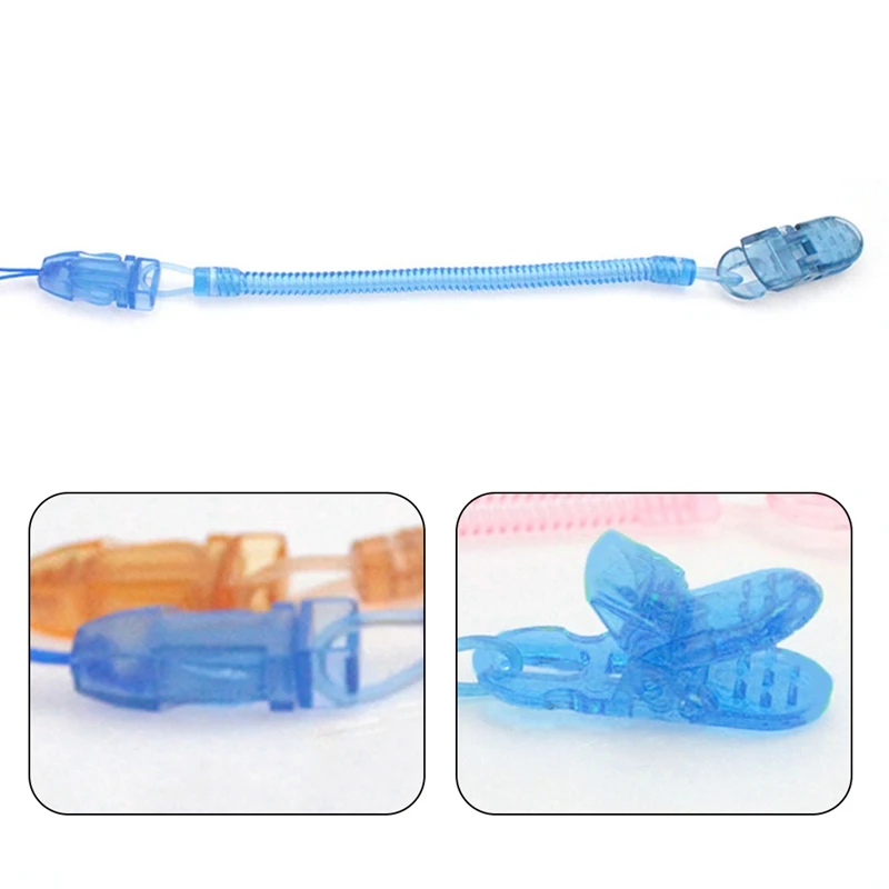 С одной стороны прищепка для крепления к одежде, а с другой защелка с петелькой, как раньше были на шнурках для телефонов, петелька на удавку завязывается на соску и защелкивается на шнурок