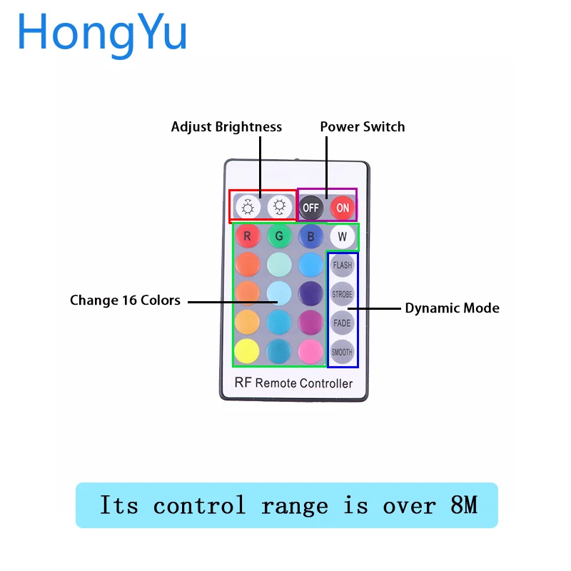 3) принимает RF led контроллер, который имеет 24 кнопки, функция каждой кнопки как таблица ниже: