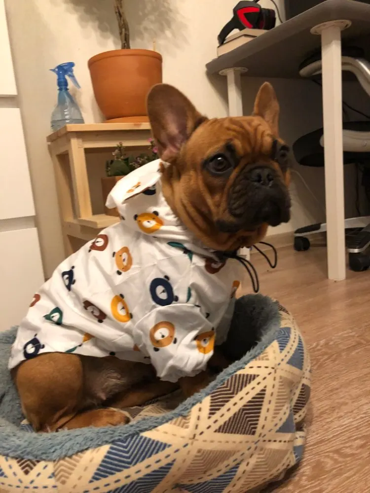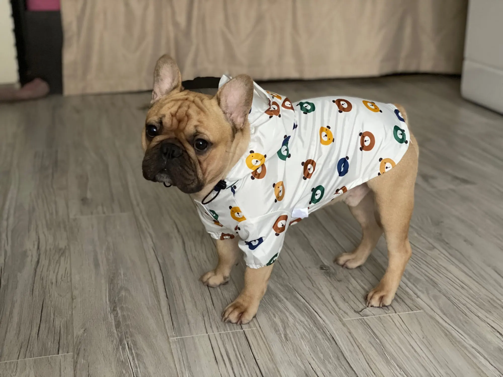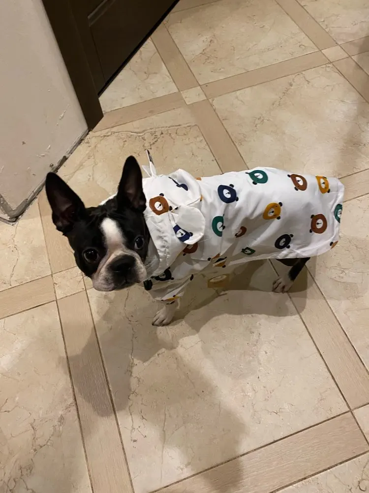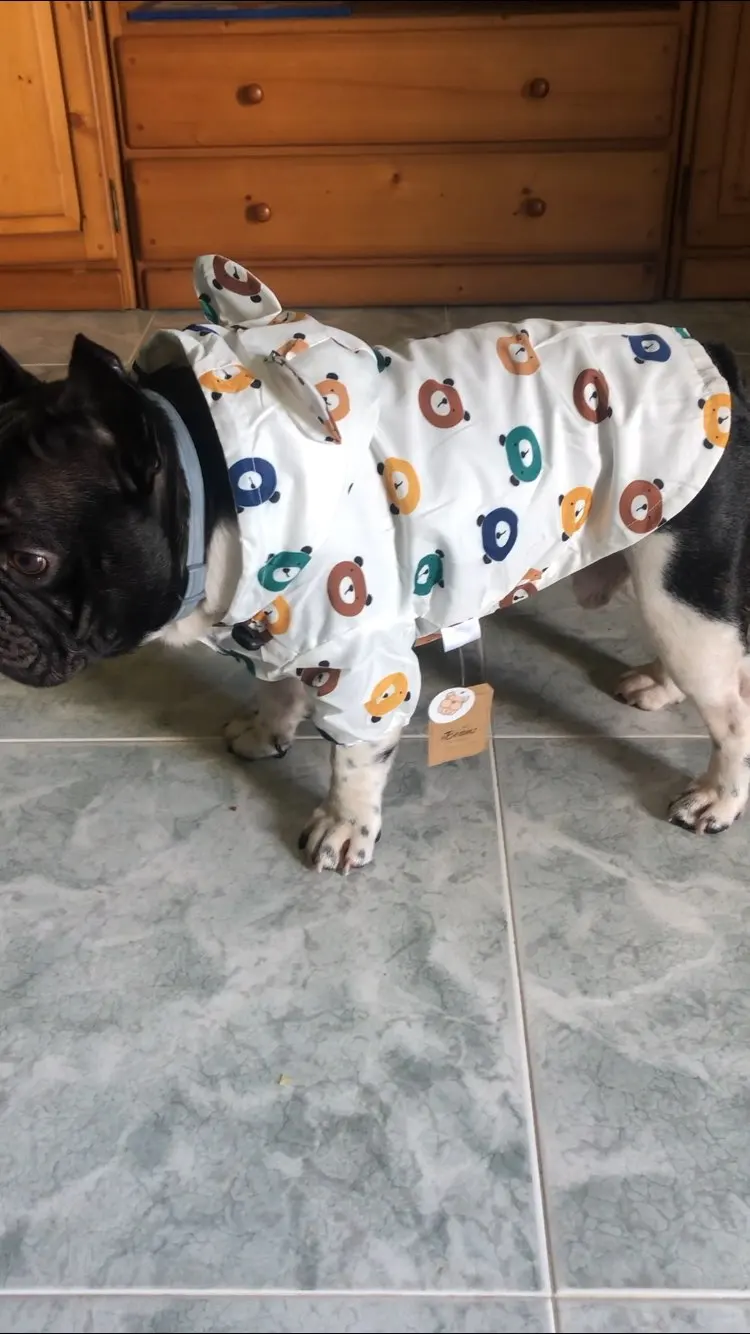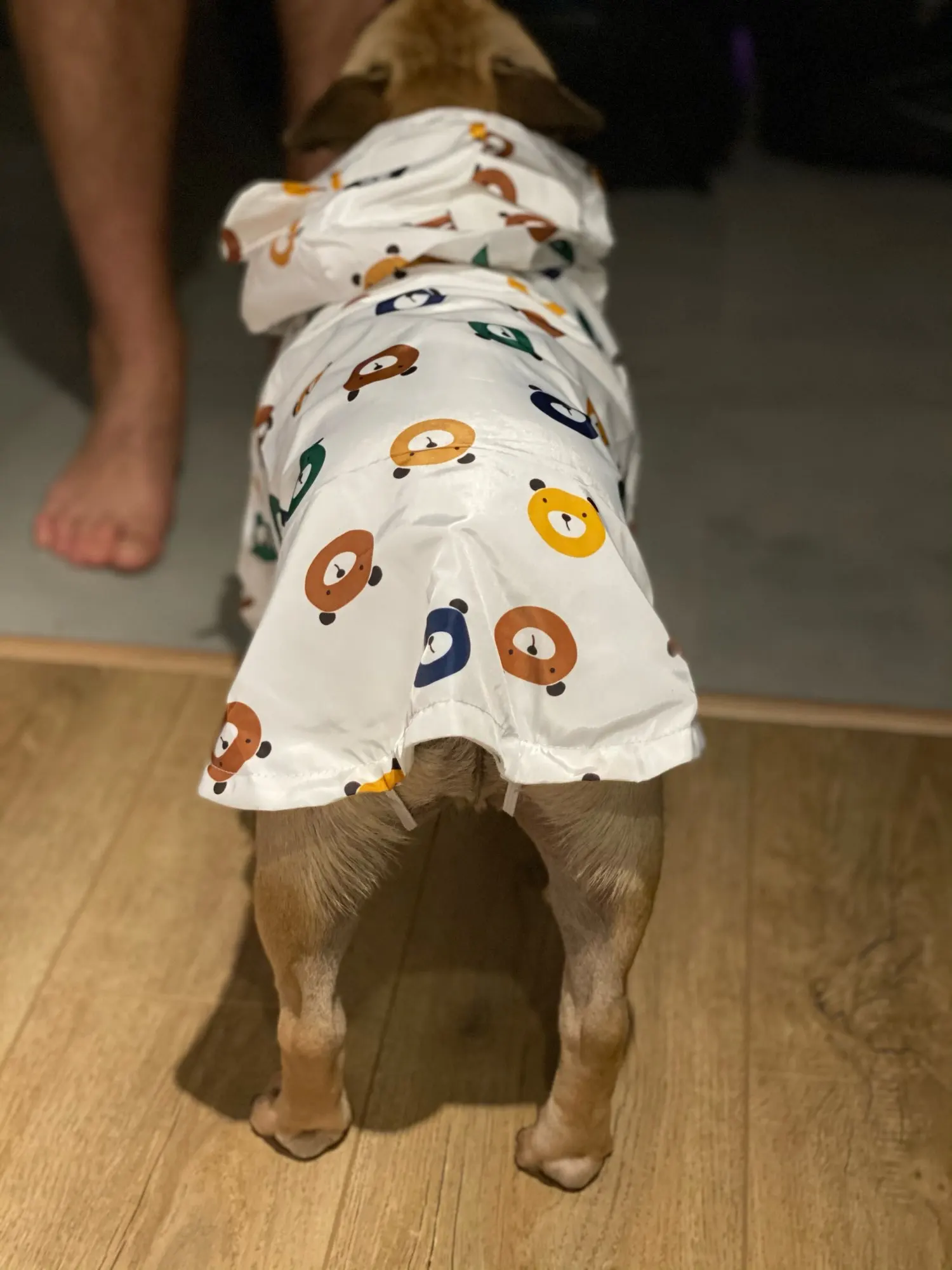 Классный дождевик!! На французского бульдога подошёл очень хорошо, чуть длинноват по спине, но не критично!!