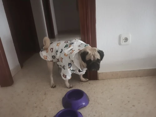 Великолепная одежда, она идеально подходит для тела моего 1 года Карлина и около 13 кг. Она прекрасно работает, потому что вчера вы уже дали первое использование защищает perrete довольно хорошо. У него есть отверстие на высоте спины для ремня, который больше похож на arnes, чем для воротника и несколько капель на спине, так что он лучше подходит для задних ног и дает ему лучше удерживайте.