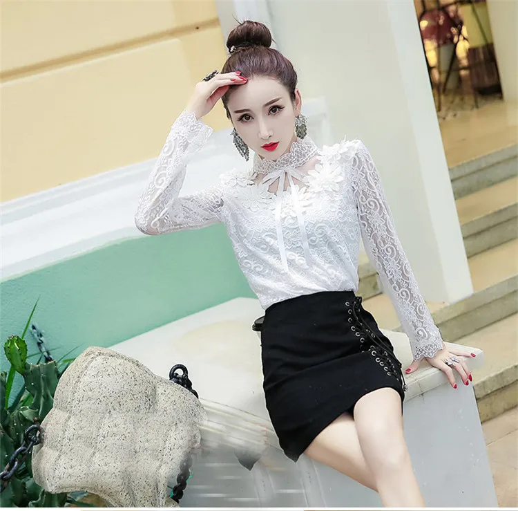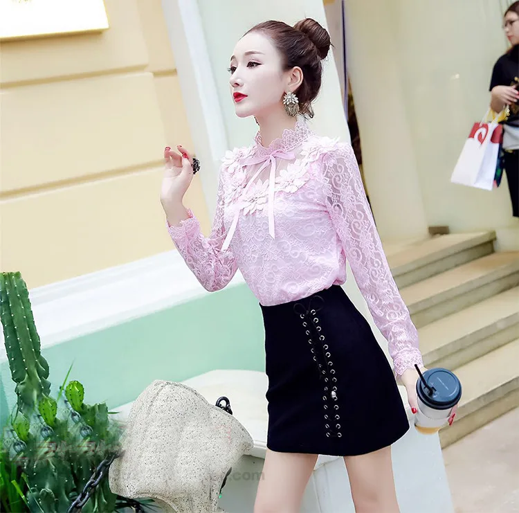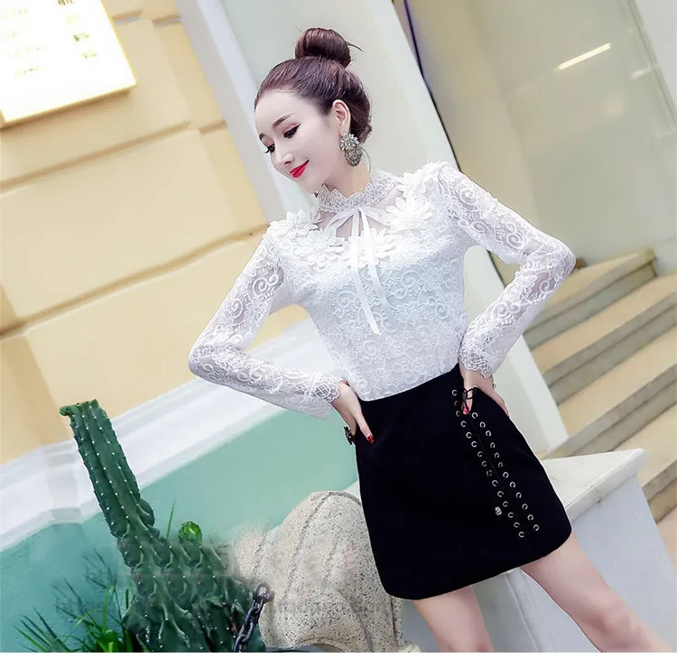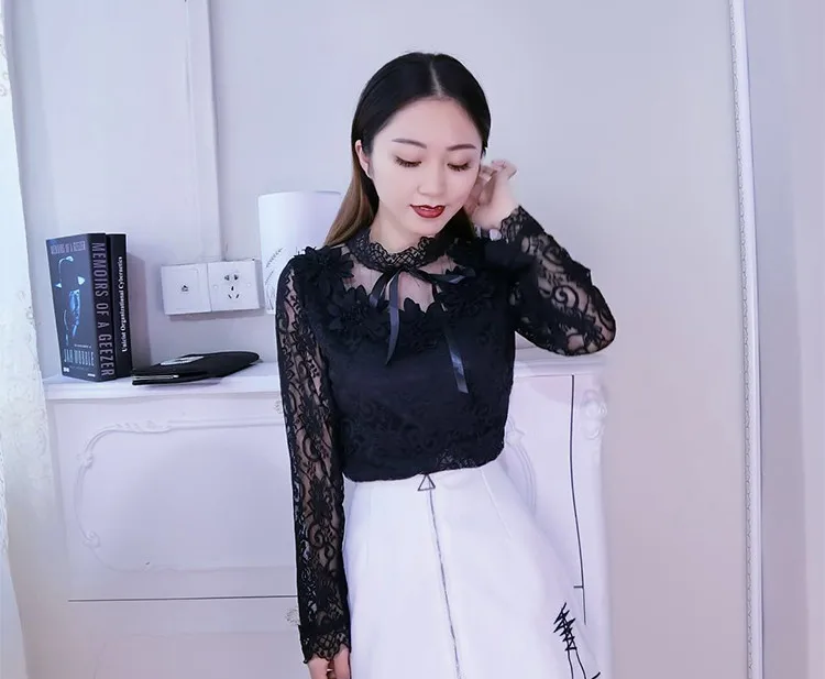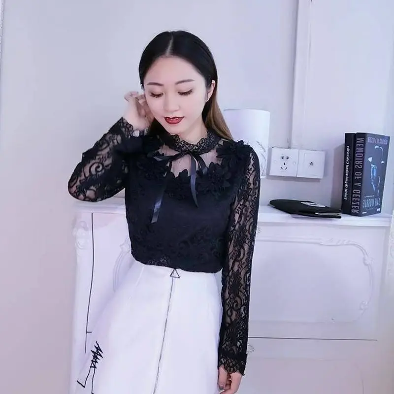 Женская кружевная блузка с бантом, с длинным рукавом и цветочным узором, весна 2021, X01F