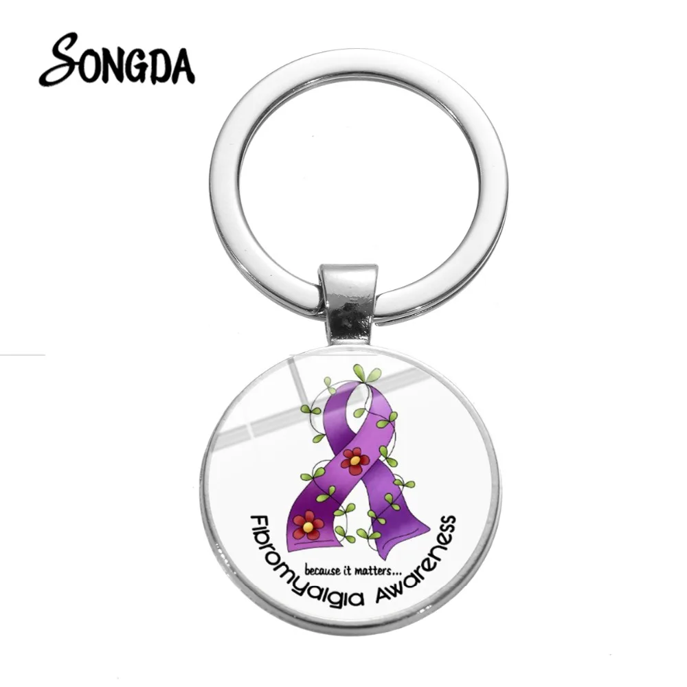 Брелок для ключей с изображением фибромилгии, цветочный принт, пурпурная лента, художественный узор, стеклянный брелок для ключей, держатель, символ мира, любви, лучший подарок