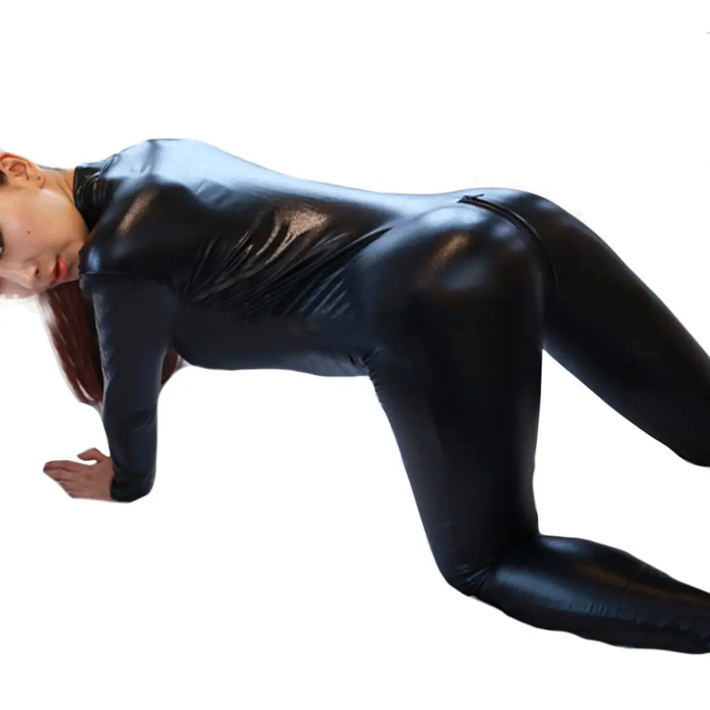 Комбинезон из искусственной кожи пу, женские комбинезоны с длинным рукавом и открытой молнией, обтягивающие штаны, облегающие Клубные Комбинезоны из спандекса, комбинезон