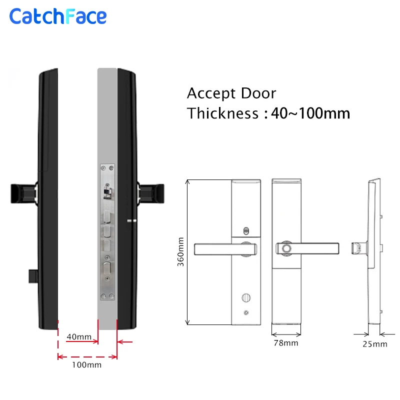 Размер панели: 360 мм x 78 мм x 25 мм Цвет: черный Материал: цинковый сплав Способ открытия: Bluetooth/приложение/Пароль/отпечаток пальца/карта/ключ Тип цилиндра: цилиндр лезвия класса C Применение: семья, квартира, школа, офис Функциональность: деревянная дверь/защитная дверь/огнеупорная дверь/нержавеющая дверь Корпус замка: устойчив к пилению/растяжению/постороннему/противоугонному Источник питания: 4 батарейки AA (не входят в комплект) Подходит для толщины двери: 1,57-4,33 дюйма или 40-110 мм Количество групп хранения отпечатков пальцев: 200 Аксессуары: 3 брелока + 2 браслета + 2 механических ключа