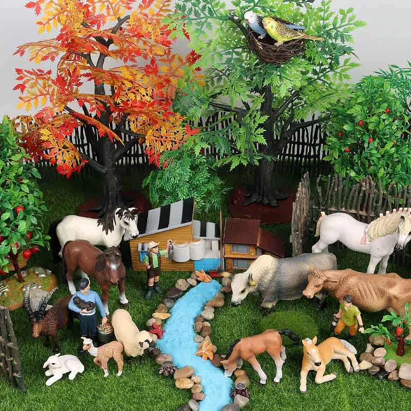 Характеристика:Oenux Моделирование Милая птица ферма животные корова птица собака фигурку Украшение дома Дерево Модель газона фигурки Детские игрушки
