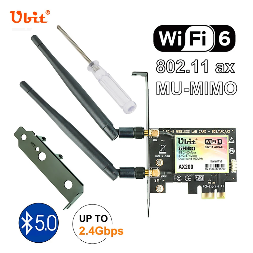 Ubit Bluetooth 5,0 | 2,4 Гбит/с Pcie Wi-Fi карты Gigabit Dual Band сетевая карта Wi-Fi 6 AX200 802.11ax Dual band 2x2 160 МГц Беспроводной адаптер для настольных ПК Windows 10