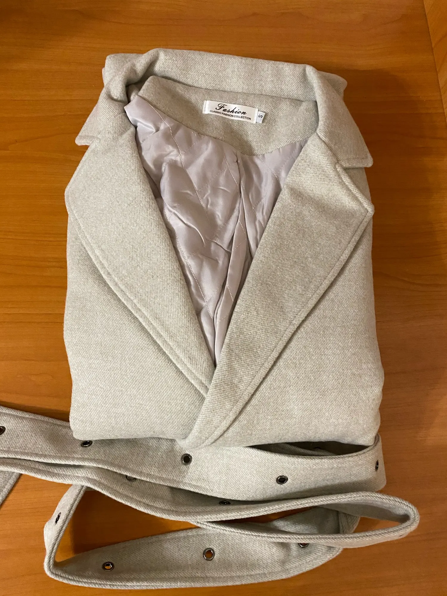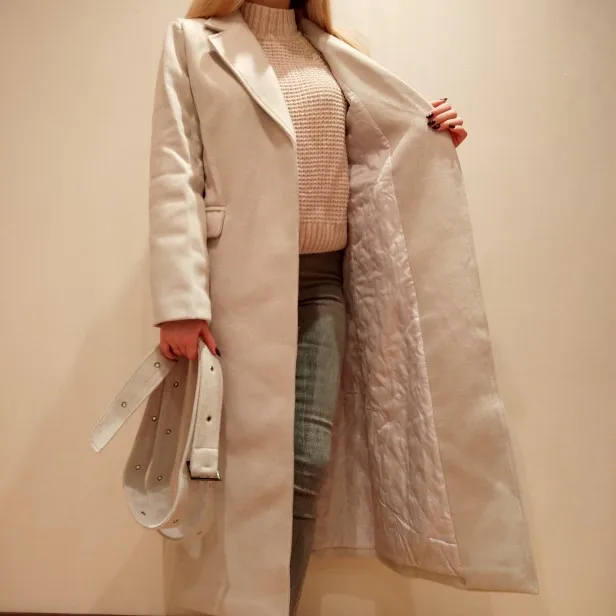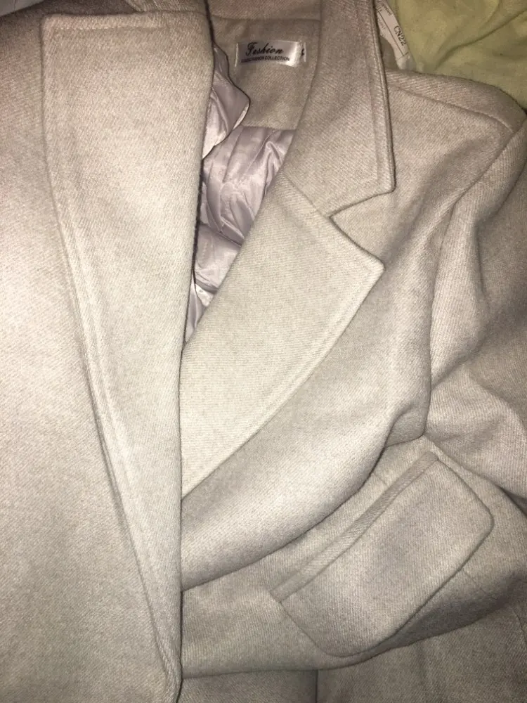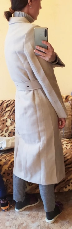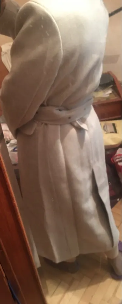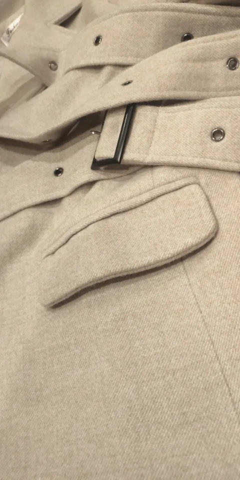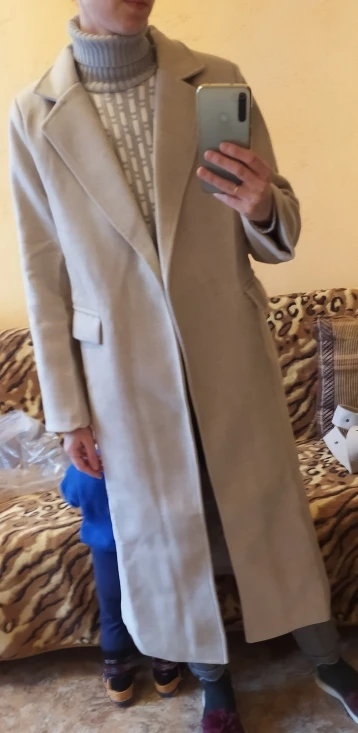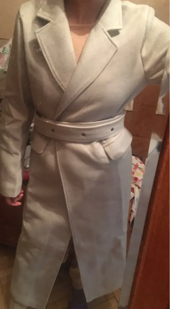 хорошее, красивое пальто. цвет серо-бежевый. пришло за месяц. мой рост 176 см, плечи 38 см, ОГ 82 см. брала М, в толстом свитере помещаюсь комфортно. рукава достаточно широкие, со свитером комфортно, не жмет. длина пальто и рукавов на мой рост хорошая. подкладка с утеплителем (по ощущениям слой синтепона). пояс очень длинный, мне больше нравится с черным кожаным ремнем. хочу пришить магнитные кнопки, чтоб не раскрывалось при хотьбе. к сожалению мне пришло изделие с браком(кривые строчки на лацкане и узелки на ткани, на фото 2 крупных, ещё было штуки 4 мелких, заправила их вовнутрь как затяжки). открыла спор, Али вернул 500р. носить буду. за эту цену неплохо