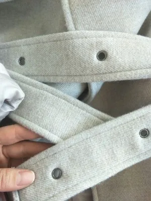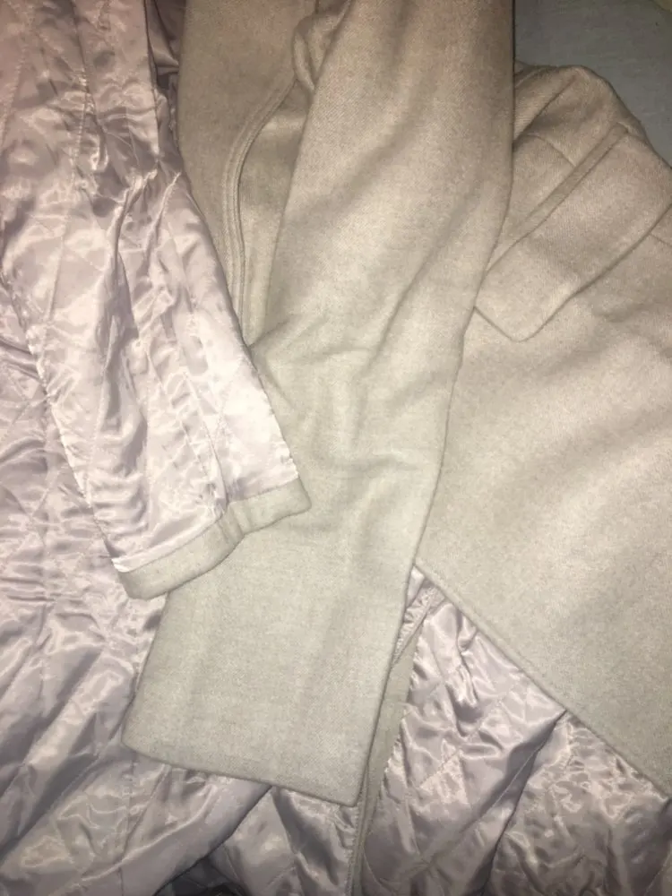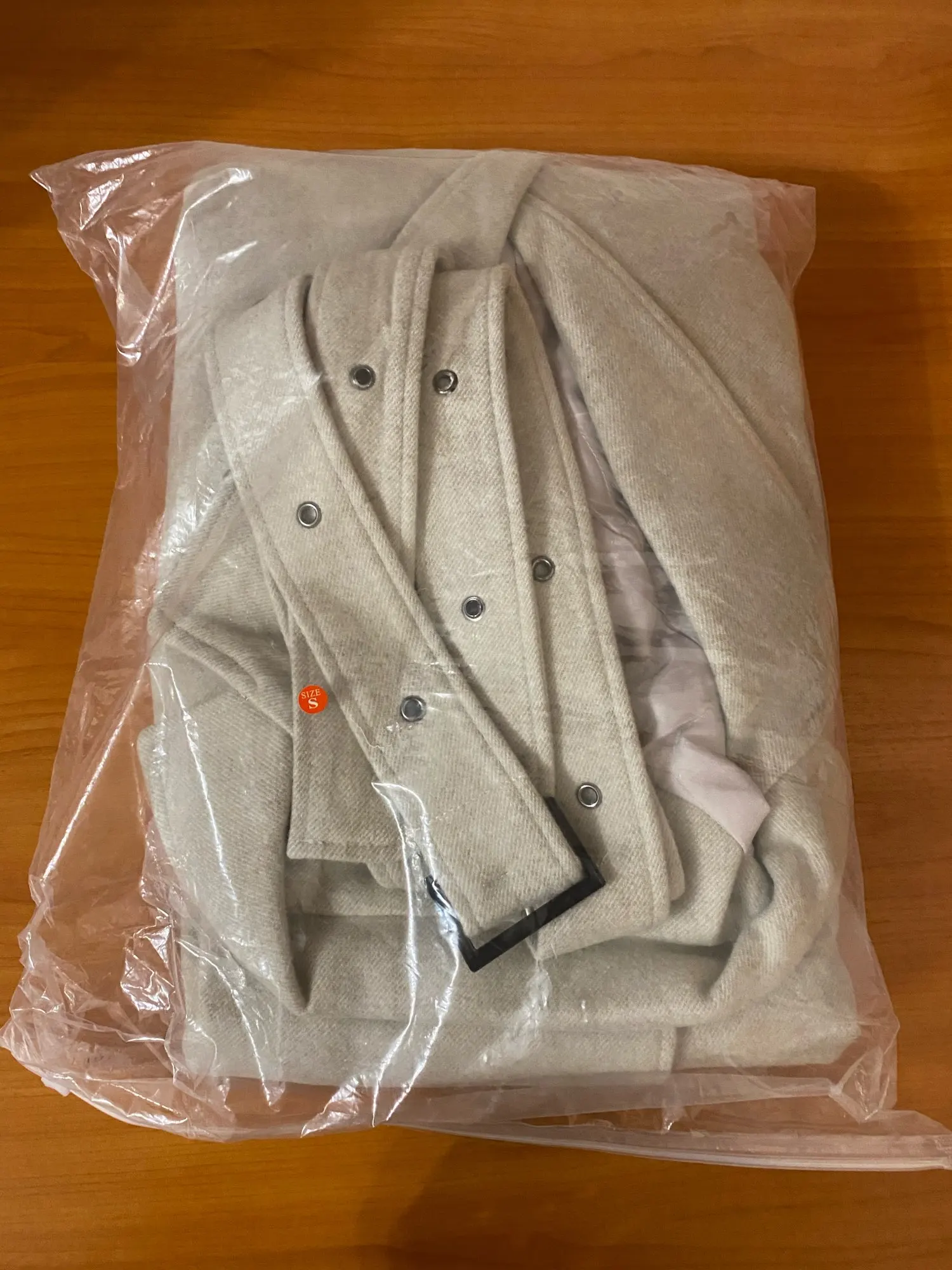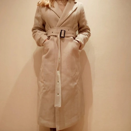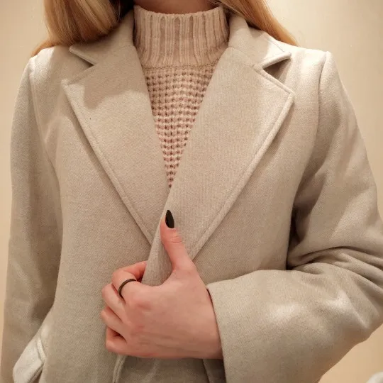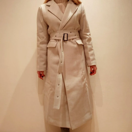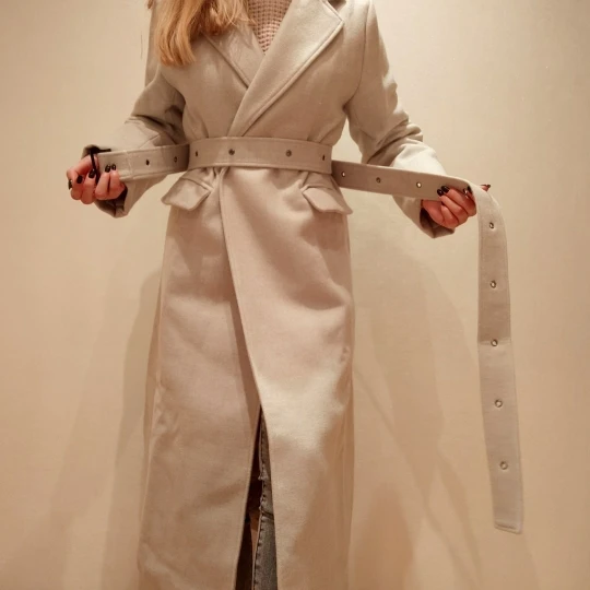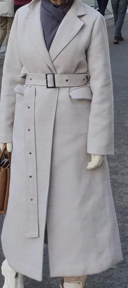 хорошее, красивое пальто. цвет серо-бежевый. пришло за месяц. мой рост 176 см, плечи 38 см, ОГ 82 см. брала М, в толстом свитере помещаюсь комфортно. рукава достаточно широкие, со свитером комфортно, не жмет. длина пальто и рукавов на мой рост хорошая. подкладка с утеплителем (по ощущениям слой синтепона). пояс очень длинный, мне больше нравится с черным кожаным ремнем. хочу пришить магнитные кнопки, чтоб не раскрывалось при хотьбе. к сожалению мне пришло изделие с браком(кривые строчки на лацкане и узелки на ткани, на фото 2 крупных, ещё было штуки 4 мелких, заправила их вовнутрь как затяжки). открыла спор, Али вернул 500р. носить буду. за эту цену неплохо