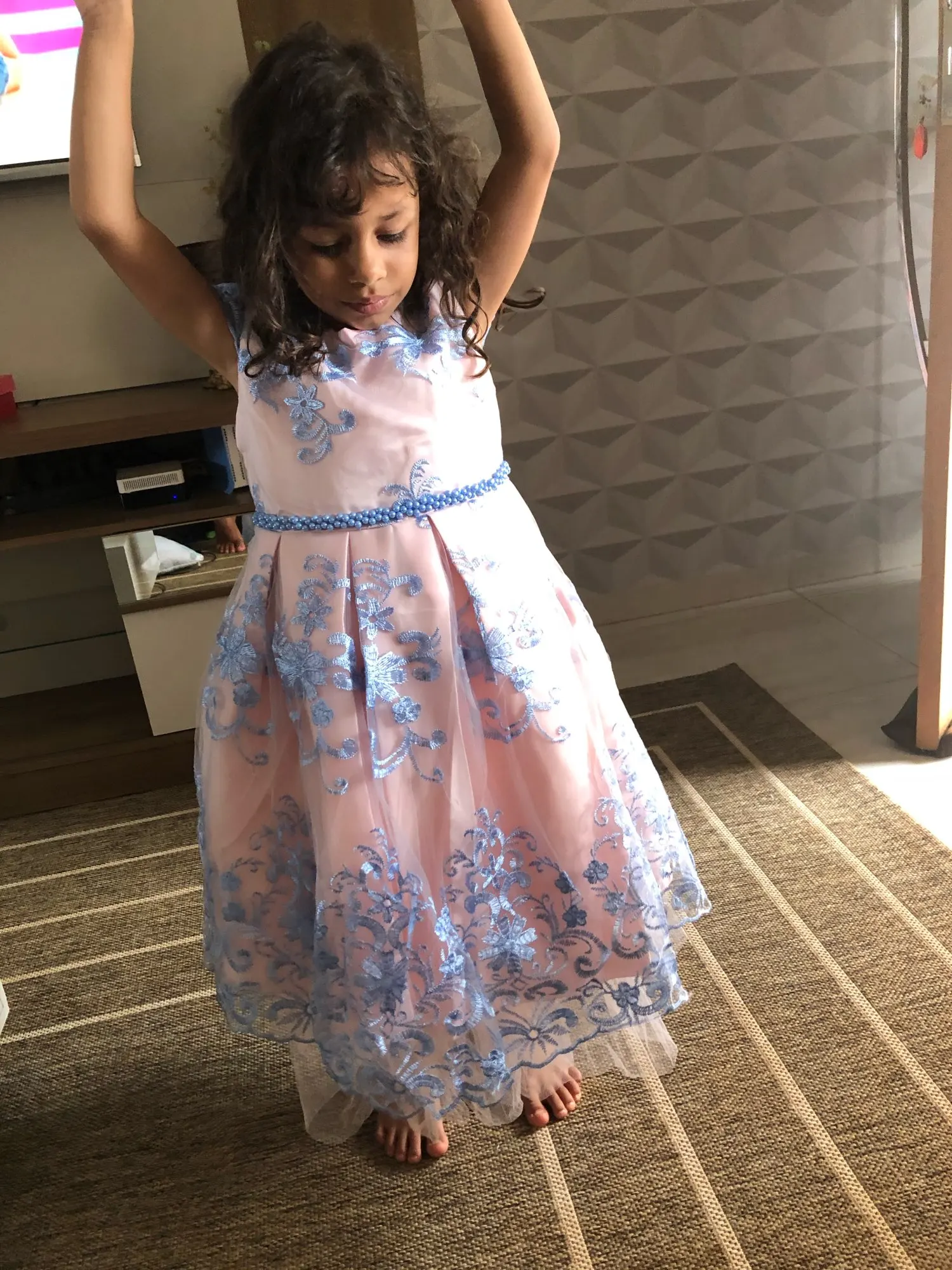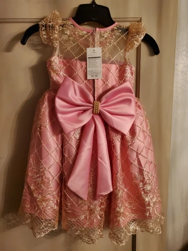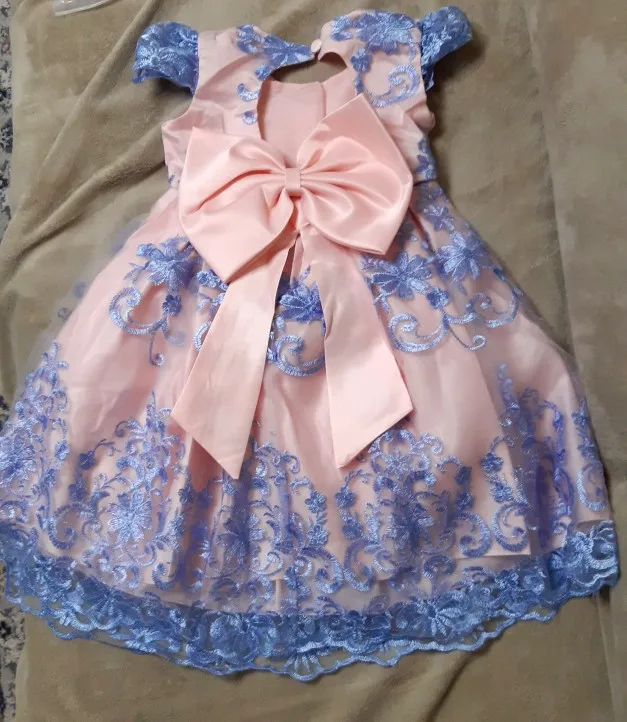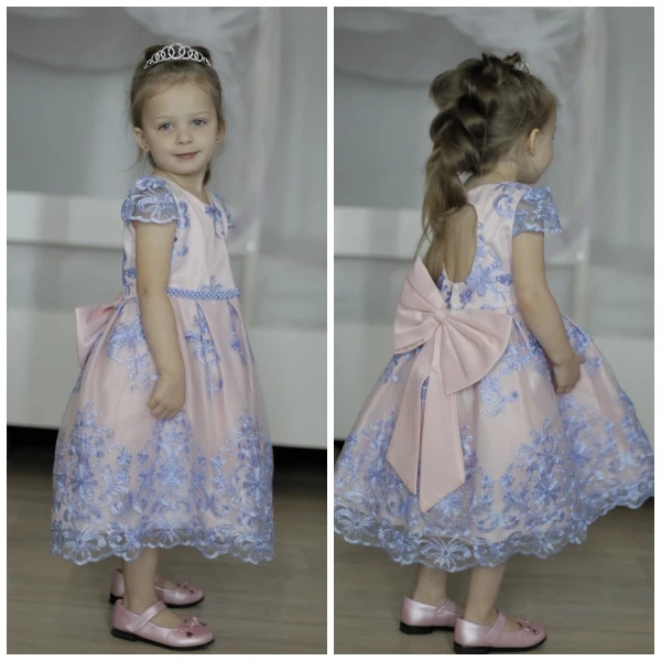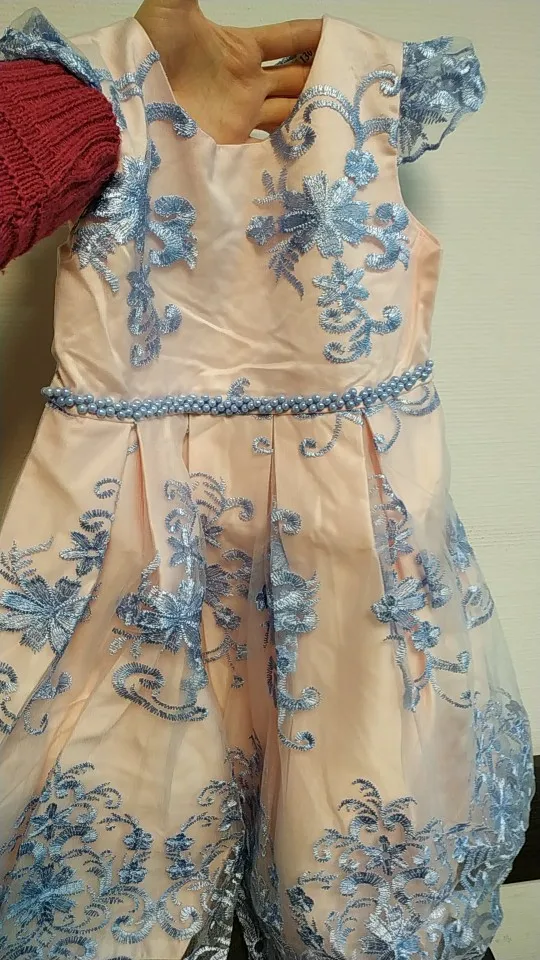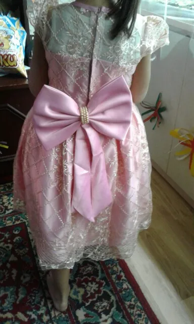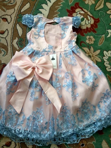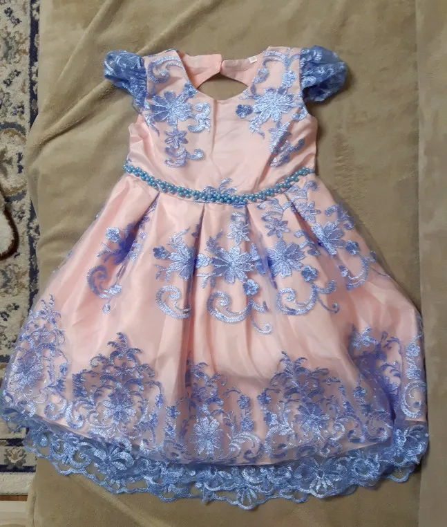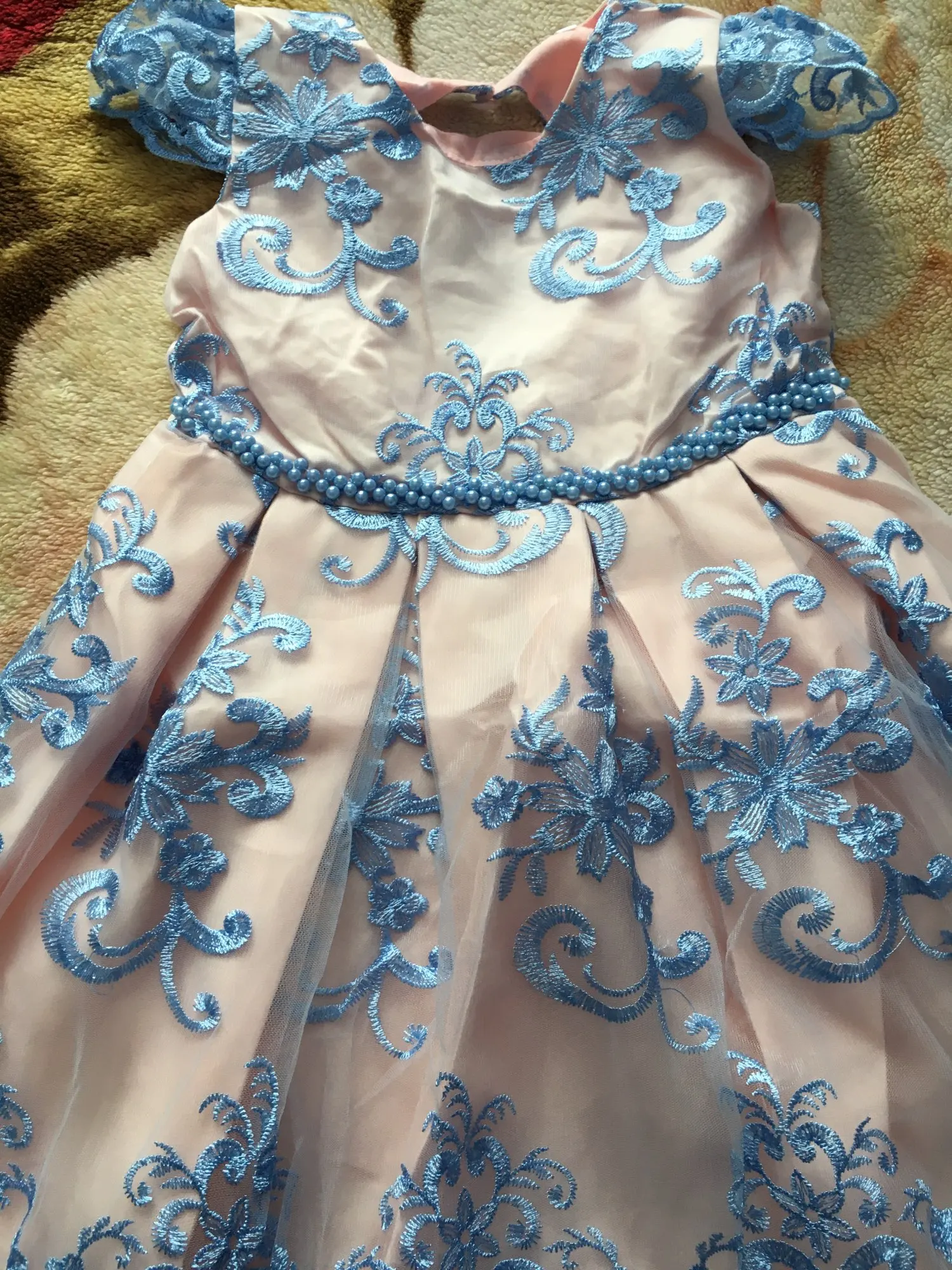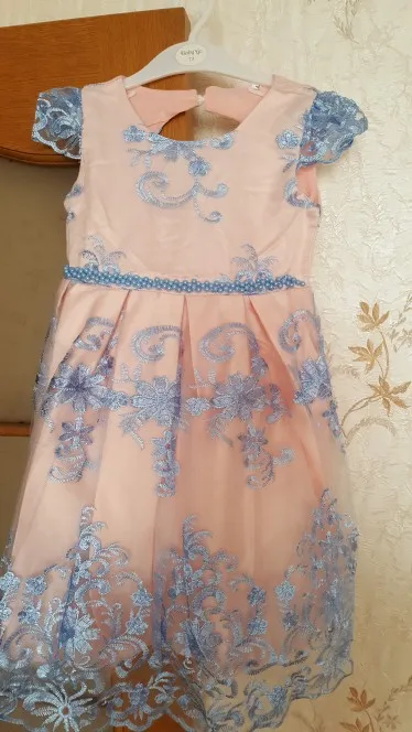 Шикарное детское платье. Платье выполнено из розового атласа, покрытого верхним слоем ажурной сетки декорированного узорами небесно голубого цвета. Сочетание цветов очень нежное. Сзади платье с открытой спинкой. Линию талии украшает огромный бант, который держится на булавке. Застегивается платье сзади на потайную молнию, а так же есть пуговка вверху на спине. Пышная длинная юбка с несколькими слоями подъюбников выгодно подчеркивают силуэт модели. Вещь сшита аккуратно: стороны симметричны, швы ровные, торчащих ниток нет. В верхней части платья имеется хлопковый подклад, чтобы ребенку ничего не "кололо" и было максимально комфортно. Рост моего ребёнка 94 см, вес 14 кг, размер платья я выбрала 4Т. Сидит платье хорошо, чуть с запасом. У продавца указан рост 110 см. Это отличный вариант платья по цене около 1000 руб. К покупке однозначно рекомендую!