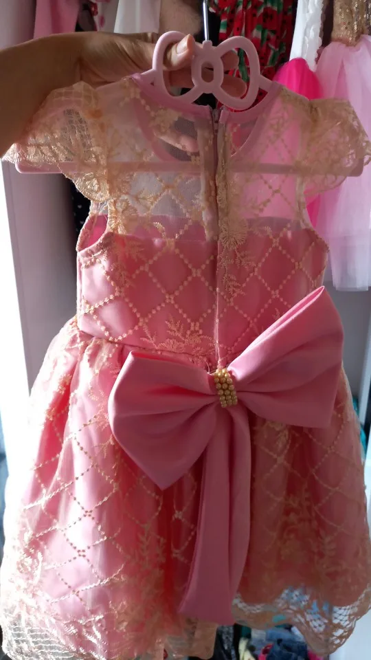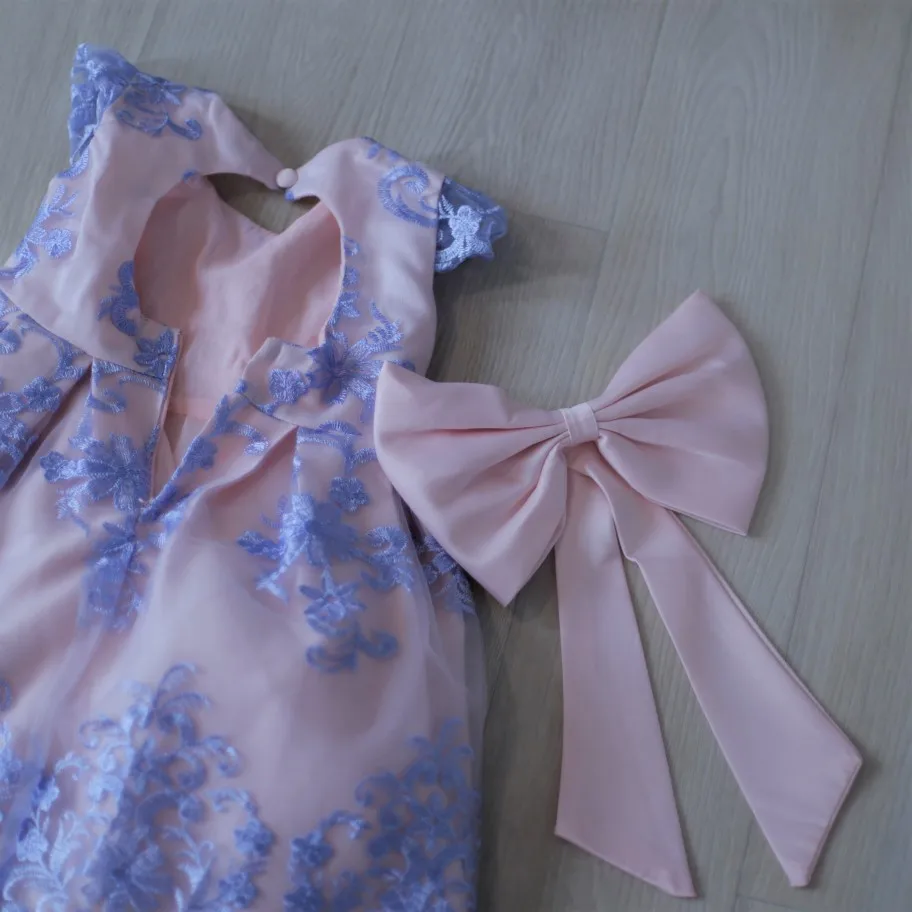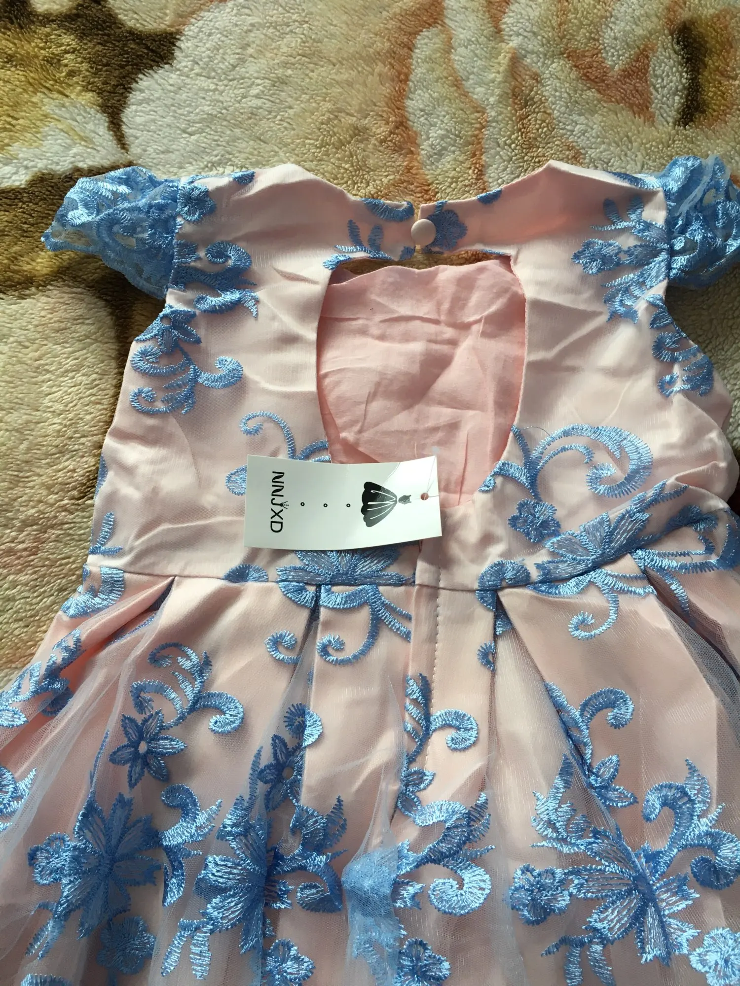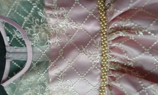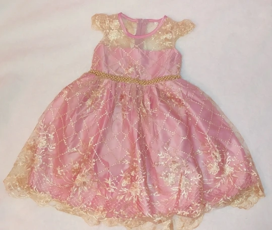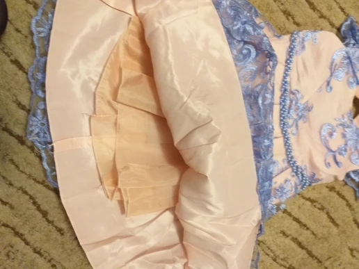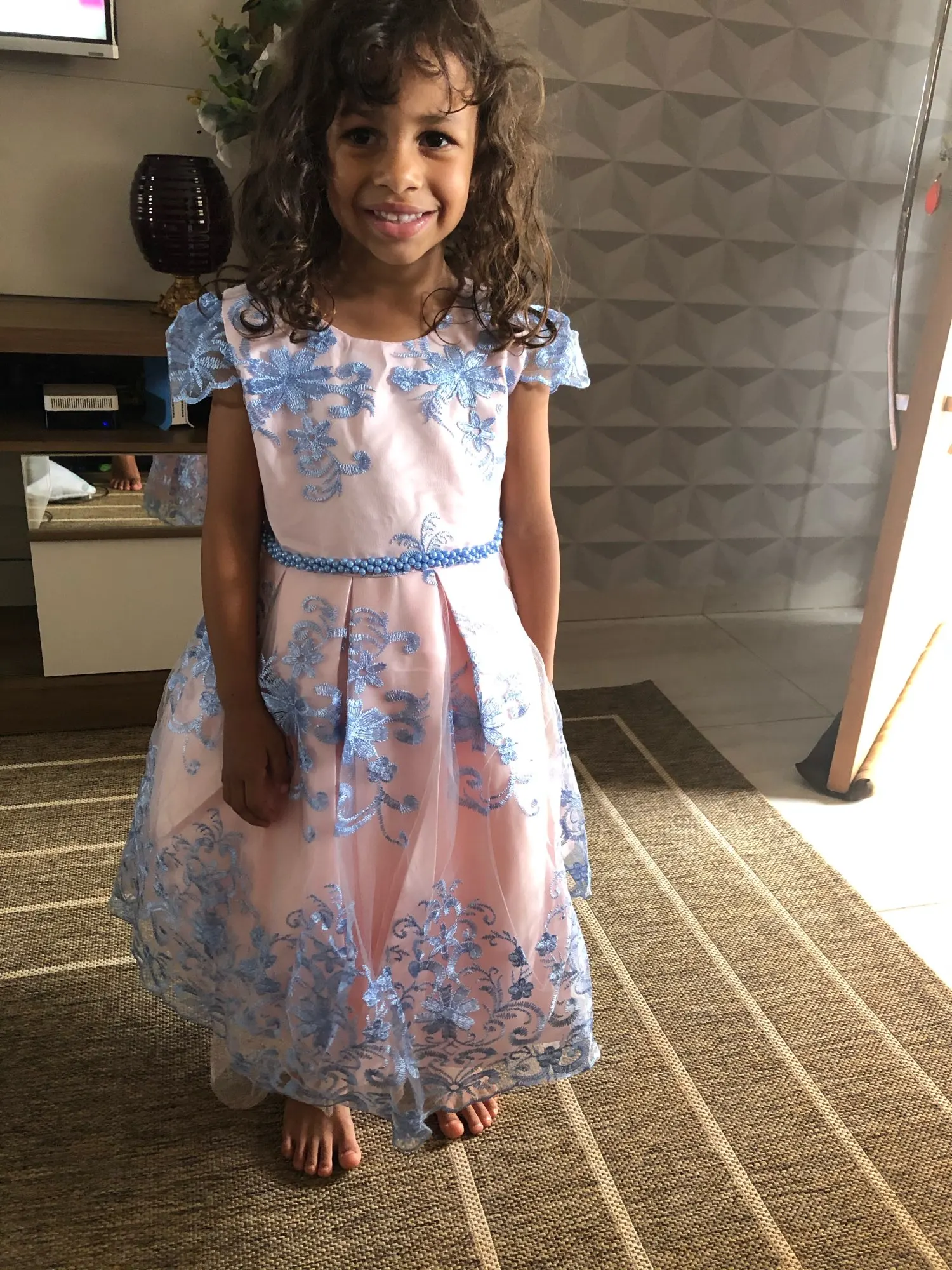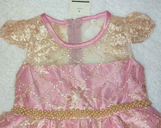 Шикарное детское платье. Платье выполнено из розового атласа, покрытого верхним слоем ажурной сетки декорированного узорами небесно голубого цвета. Сочетание цветов очень нежное. Сзади платье с открытой спинкой. Линию талии украшает огромный бант, который держится на булавке. Застегивается платье сзади на потайную молнию, а так же есть пуговка вверху на спине. Пышная длинная юбка с несколькими слоями подъюбников выгодно подчеркивают силуэт модели. Вещь сшита аккуратно: стороны симметричны, швы ровные, торчащих ниток нет. В верхней части платья имеется хлопковый подклад, чтобы ребенку ничего не "кололо" и было максимально комфортно. Рост моего ребёнка 94 см, вес 14 кг, размер платья я выбрала 4Т. Сидит платье хорошо, чуть с запасом. У продавца указан рост 110 см. Это отличный вариант платья по цене около 1000 руб. К покупке однозначно рекомендую!