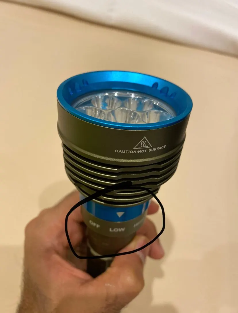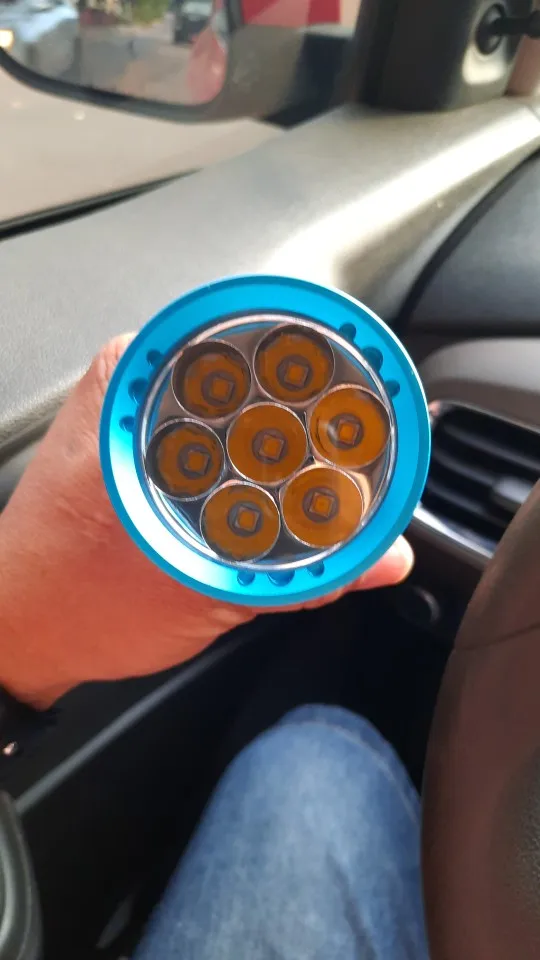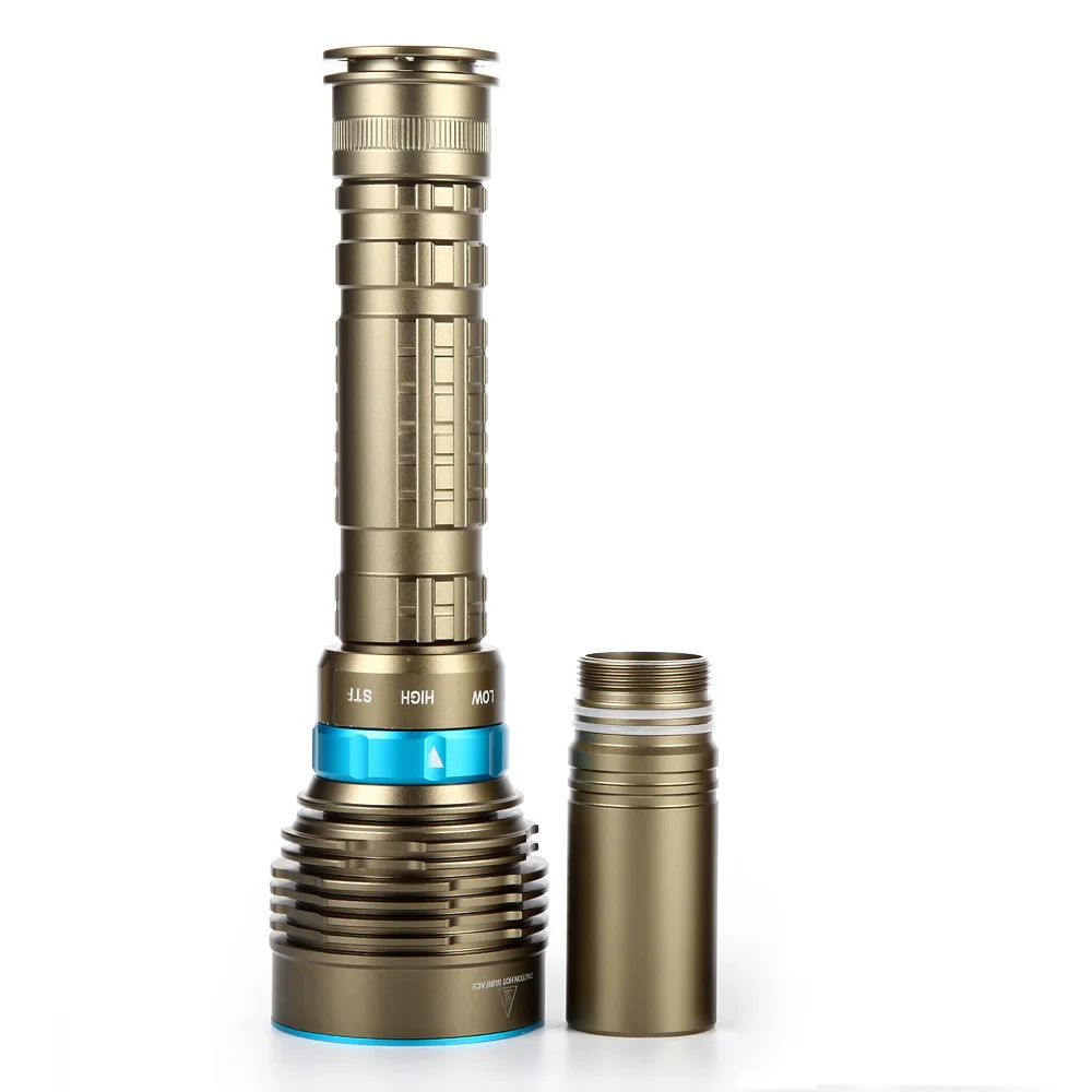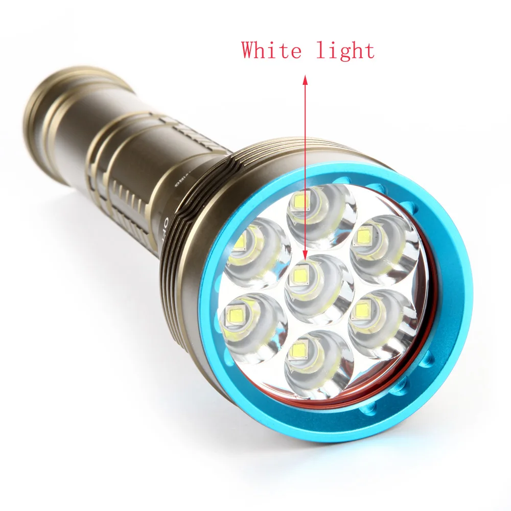 Новое поступление! 7x XM-L2 светодиодный 200 м под водойСветодиодный фонарик 7000 люмен для дайвингаФонарь светильник водонепроницаемый 1. Этот фонарь использует светодиодный фонарь 7x XM-L2, производящий очень яркий светильник.2. Выходная яркость может достигать более 7000 люменов [лм].3. Внутренняя проводка применяет высокоэффективный усилитель цепи, и может использовать батареиВ наибольшей степени4. Корпус этого фонарика изготовлен из авиационного алюминиевого сплава, и он имеет оченьПрочная конструкция.5. Жестко анодированная отделка; Анти-абразивный, не царапается, ударопрочный.6. Ультраглубокий Противоскользящий эффект trench structuresi отлично подходит для дайвинга.7. Этот фонарик использует текстурированный отражатель (а не гладкий отражатель). Луч отТекстурированный отражатель более ровный, с более постепенным переходом между горячим пятном(Центр луча) и проливание (периферия луча). Характеристика:1. Тип эмиттера: XM-L2 светодиодный2. Светильник: желтый/белый светильник3. Кол-во: 7.4. Водонепроницаемость: под водой 200 метров.5. Конфигурация батареи: 3x18650 или 3x26650 (не входит в комплект).6. Напряжение Вход: 8,4 v.7. Тип переключателя: поворот.8. Количество режимов: Низкий> Высокий> стробоскоп.9. Режим: постепенно увеличивать яркость.10. Яркость: 14000 люменов максимальная яркость.11. Светодиодный чип на плате) Срок службы: 100000 часов.12. Материал: алюминий.13. Линзы: стеклянные линзы с покрытием.14. Отражатель: Алюминиевый текстурированный отражатель.15. Размер (мм):285 мм * 63 мм * 40 мм (расширенный размер).16. Вес: 500 гПосылка включает в себя: 1x7 * XM-L2 7000LM фонарик для дайвинга