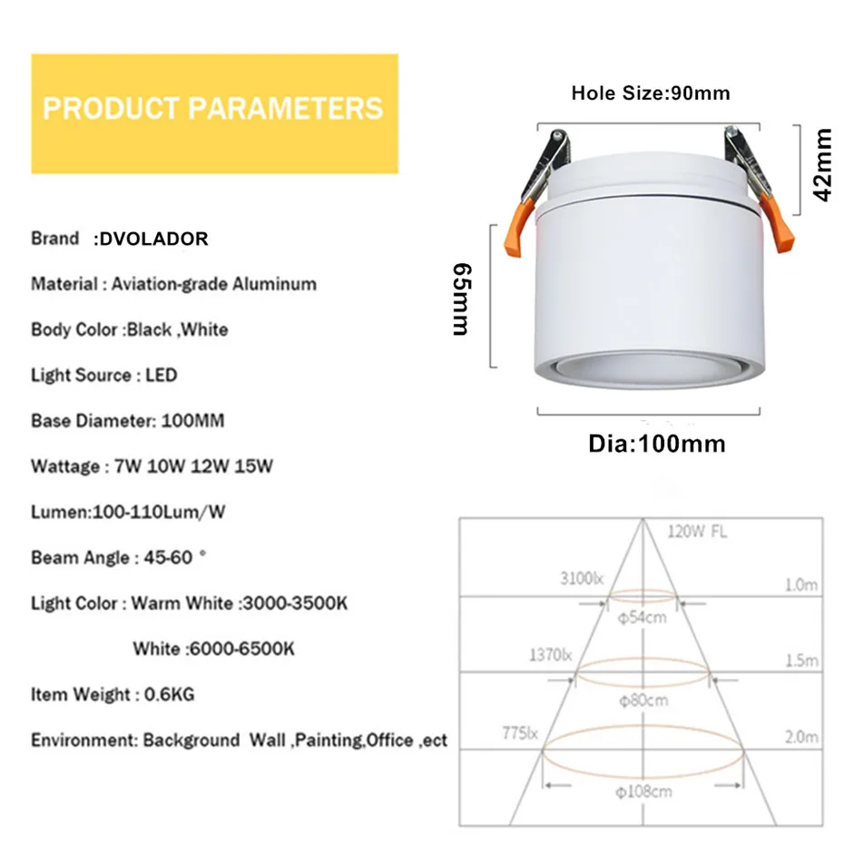 Параметры1, бренд: DVOLADOR2. Материал: авиационный алюминий3, Цвет корпуса: белый, белый + золотистый4. Тип источника светильник светодиодный светодиодные чипы COB5, Ra>906, мощность: 7 Вт 10 Вт 12 Вт 15 Вт7. Световой поток: 110 лм/Вт8, угол свечения: 45-60 градусов9. Цветовая температура: теплый белый (3000-3500K), натуральный белый (4000-4500K), белый (6000-6500K) Комплектация:1 светодиодный светильник1 светодиодный драйвер (встроенный в заднюю часть светильника)