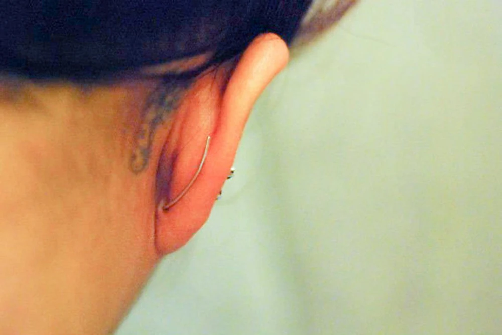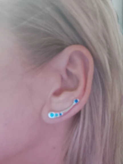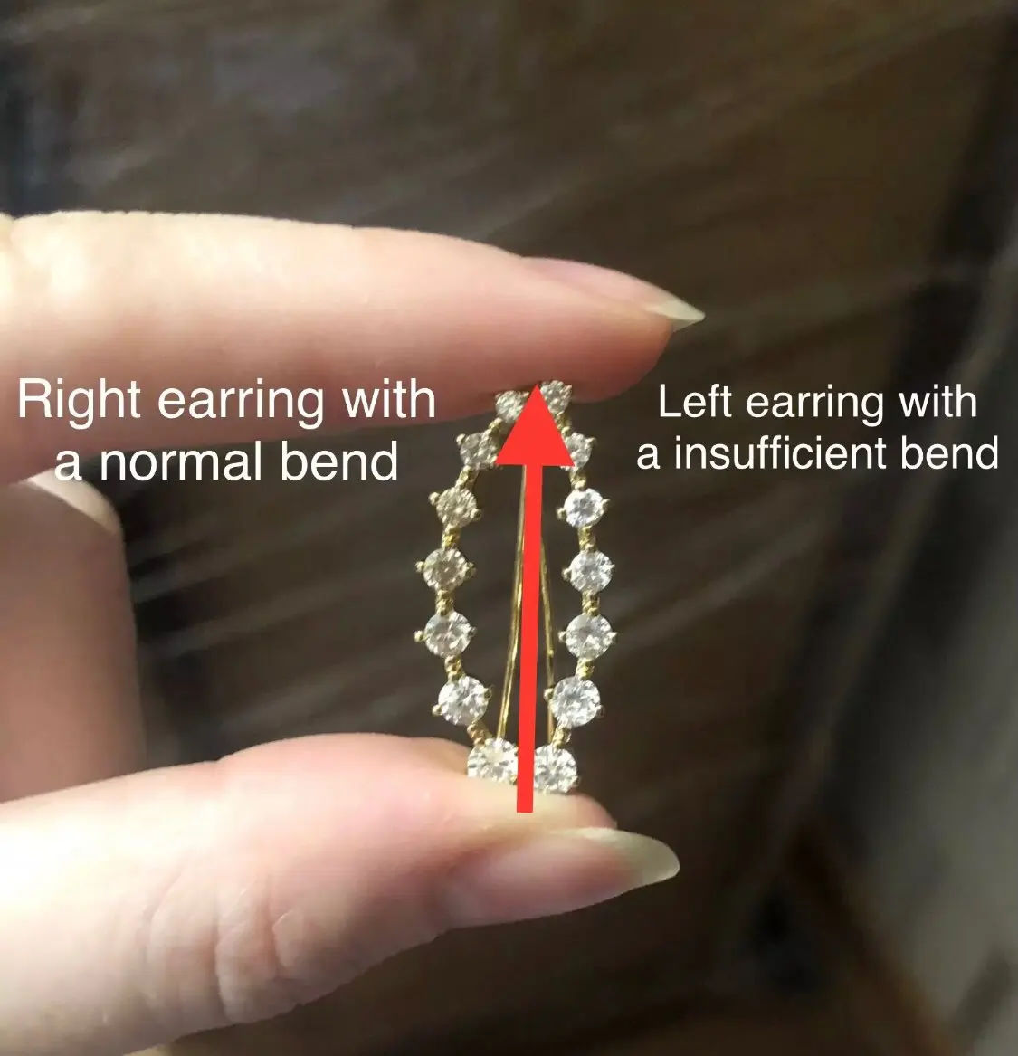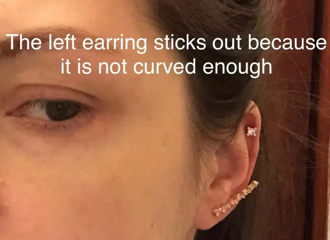 У серёг разный изгиб, соответственно сидят на ушах по-разному. Та, где меньше изгиб, некрасиво торчит и спадает, см фото