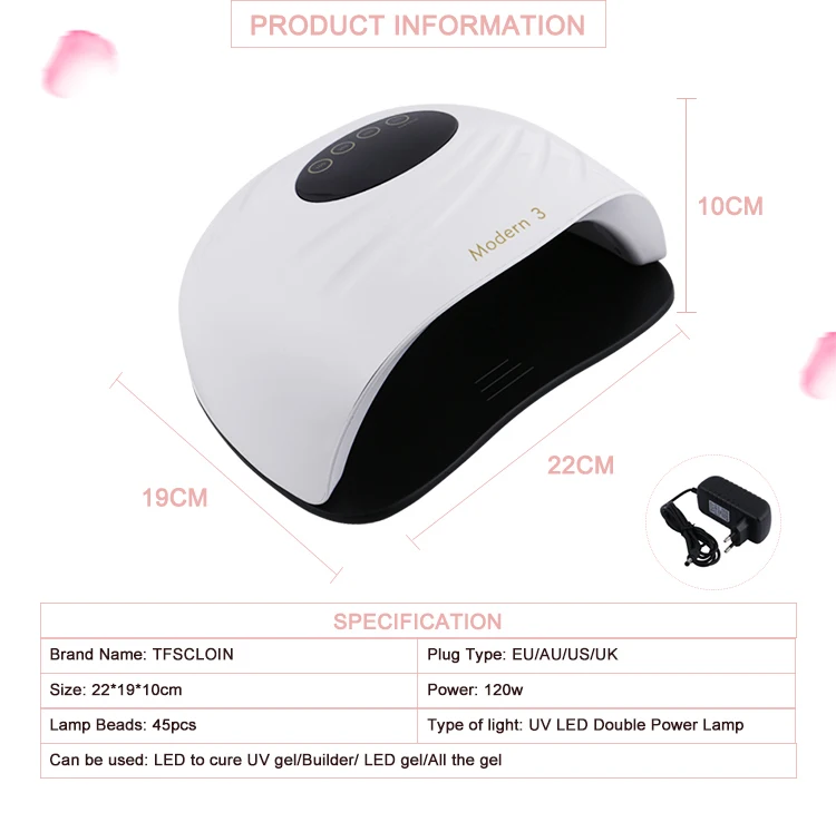 Спецификация:Тип: лампа с автоматическим датчиком для ногтейМатериал: АБСМаксимальная мощность: 120 ВтНастройка времени: 10 с, 30 с, 60 с (сенсорная кнопка)Режим без боли: Таймер 99 сВилка: вилка США, ЕС, Великобритании, Австралии опциональноПодходящий тип геля: все типы гель-лака для ногтейАдаптер: Номинальный Вход: 100-240 В, 50-60 ГцНоминальная мощность: 24 В постоянного токаДлина волны: 365 нм + 405 нм Применение:Красота ногтейМаникюрный салонНаружное использованиеСпа для ногтей, тренировок и т. д.Посылка тация:1 Светодиодная УФ-лампа1 * блок питанияСоветы по Нейл-Арту:Почему нижний клей не высохнет?После лампа для клея на поверхности останется Слой жира (липкого на ощупь), это нормальное явление, потому что следующий слой цветного клея должен быть приклеен, поэтому не прикасайтесь к нему руками, следуйте инструкциям для следующего шага, продолжайте цветной клей.Почему лак для ногтей не сушит?У разных марок клея разные ингредиенты, на некоторых клеях будет образоваться плавающий клей, не прикасайтесь к нему вручную, просто нанесите уплотнительный слой.Почему уплотнительный слой не высохнет?Есть как одноразовые, так и скребковые уплотнения, скребковый слой не сухой. После запекания слоя для очистки поверхности останется слой масла. Вам нужно использовать профессиональную очистку лака для ногтей, чтобы высушить поверхность масла.