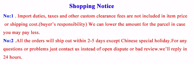1.Импортные пошлины, налоги и другие таможенные сборы не включены в цену товара или стоимость доставки.Это ответственность покупателя. Пожалуйста, проверьте в вашем таможенном офисе, чтобы определить, какие дополнительные расходы будут до вашей покупки. Мы можем декларировать более низкую стоимость, чтобы помочь вам избежать некоторых налогов по вашему запросу.