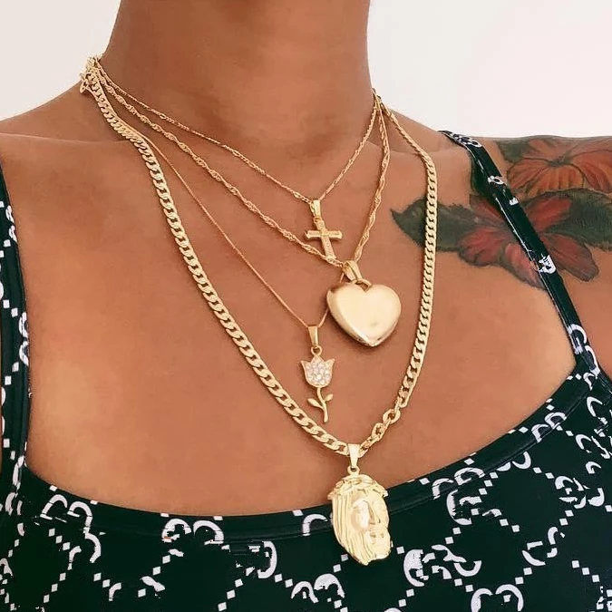 Винтажное женское золотое ожерелье, сердце, крест, пирамида, старин...