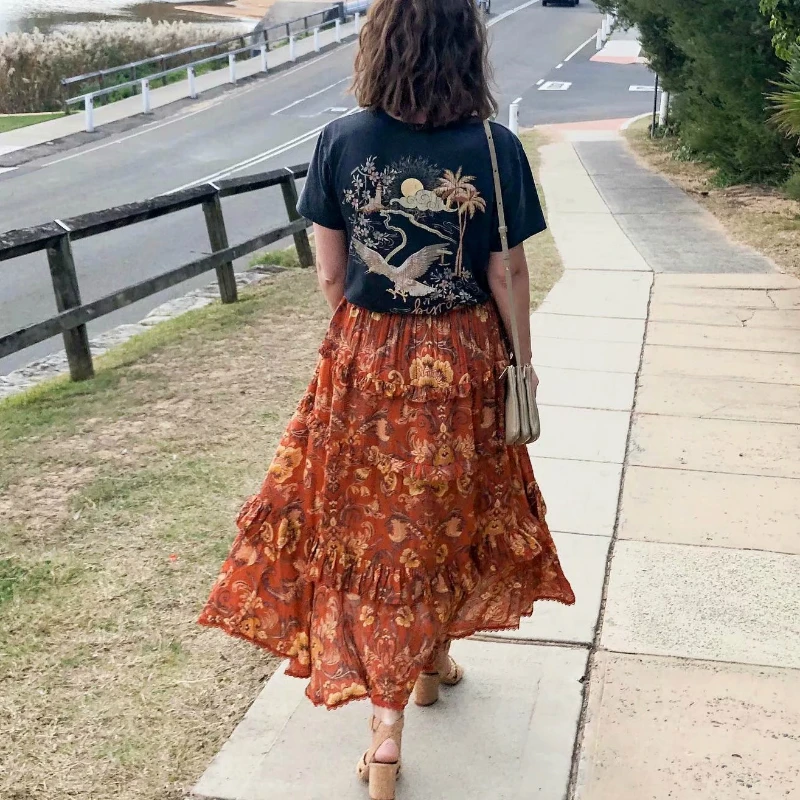 Винтажная шикарная модная женская пляжная юбка в стиле хиппи с цветочным принтом и оборками юбка макси А-силуэта с высокой эластичной талией в стиле бохо женские юбки