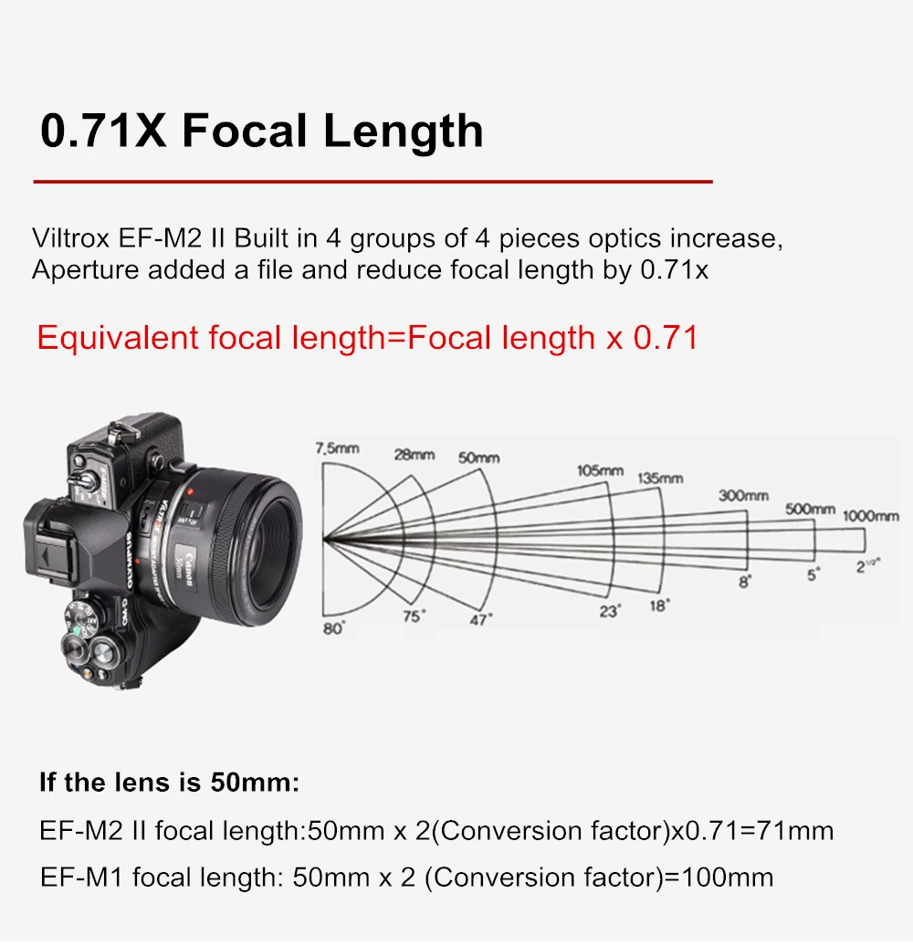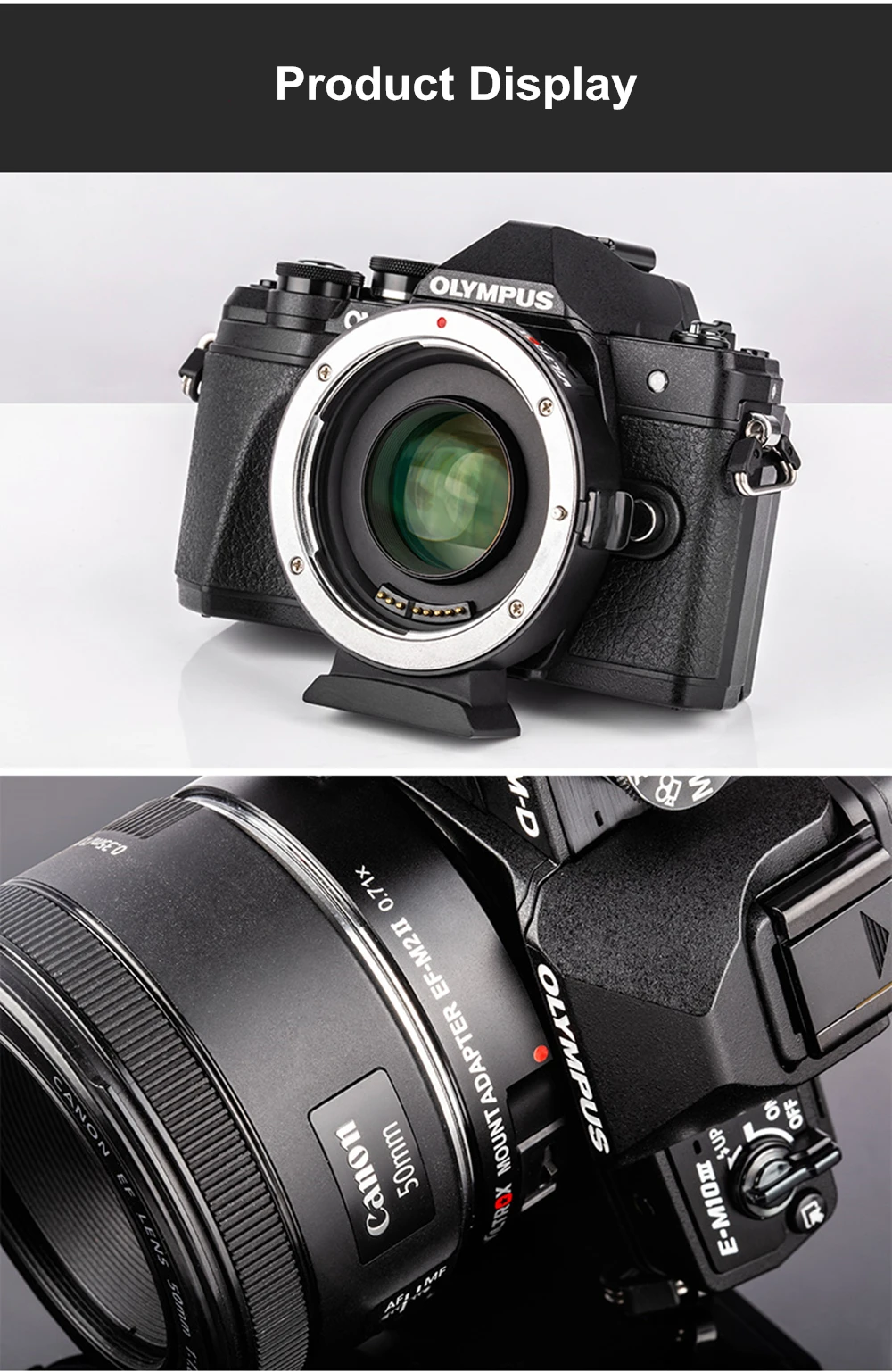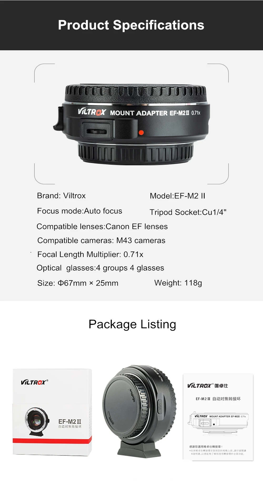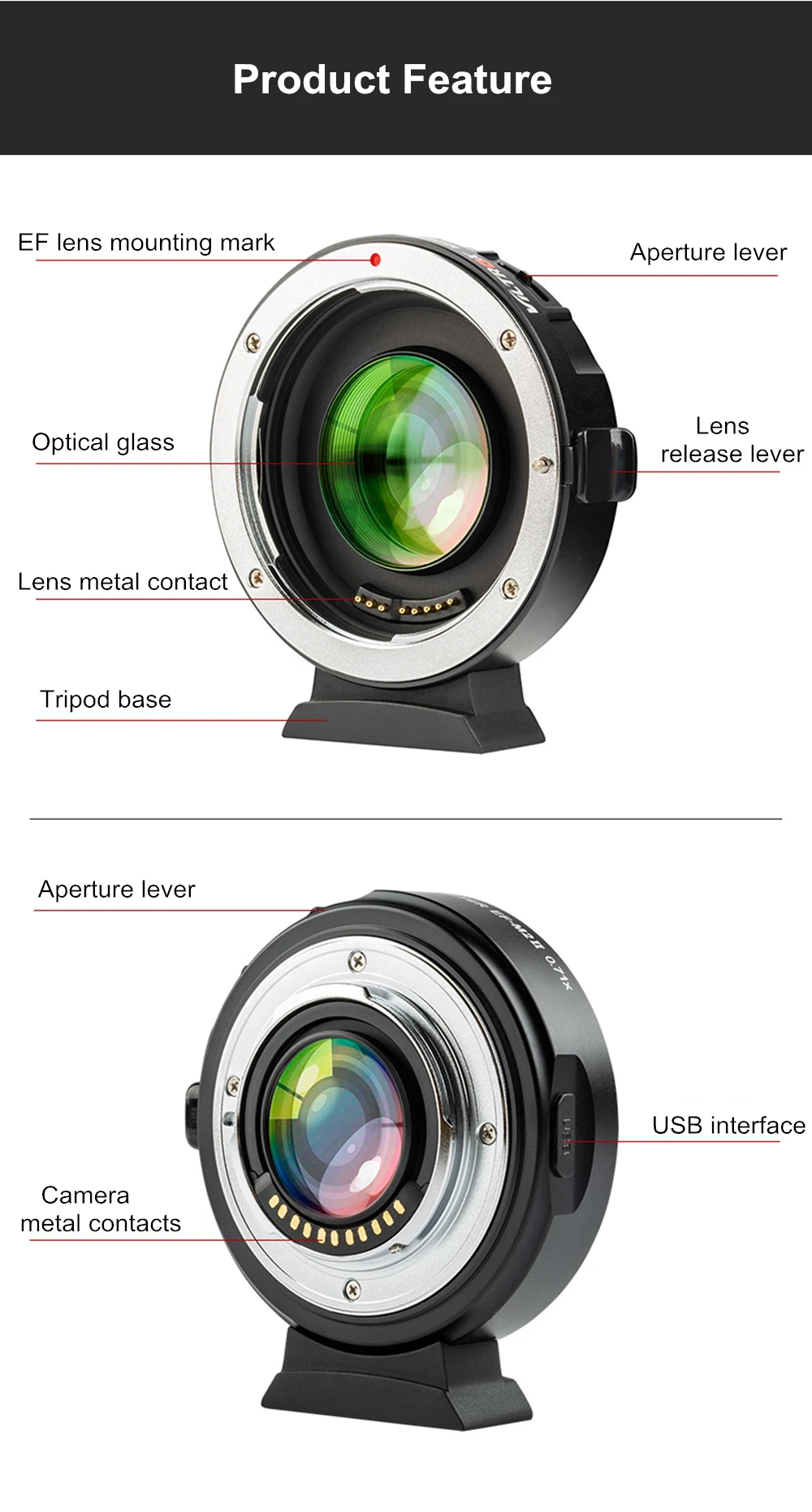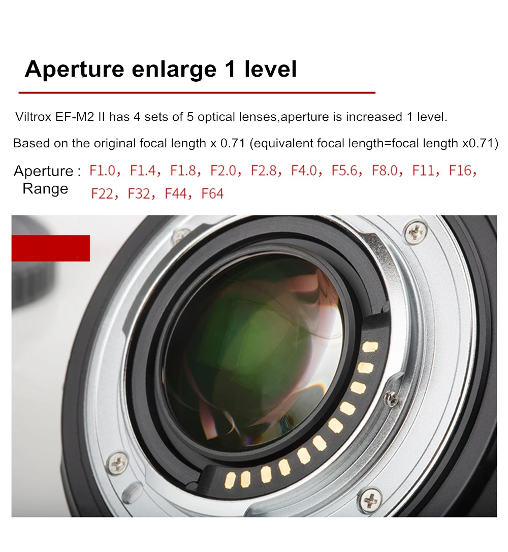 Адаптер крепления Viltrox EF-M2II предназначен для Canon EF-mount series lens для использования на камере M43. Плюс 0,71 на основе оригинального Фокусное расстояние (эквивалент фокусное расстояние = фокусное расстояние x0.71), который поможет увеличить диафрагму 1 уровня. Встроенный 4 группы, 4 шт оптических очков, AF (автофокус) и регулируемой диафрагмы и т. Д. Чтобы обновить прошивку адаптера, последнюю прошивку можно загрузить с официального сайта, подключить адаптер к компьютеру с помощью usb-кабеля и скопировать файл в память адаптера. Не требуется прикрепить объектив или камеру. Чтобы изменить режим AF, выключите камеру, выньте батарею, Вставьте батарею и включите камеру снова, чтобы камера распознает новый режим AF как новый объектив. Медленный фокус будет происходить на низких концах линз в режиме CDAF