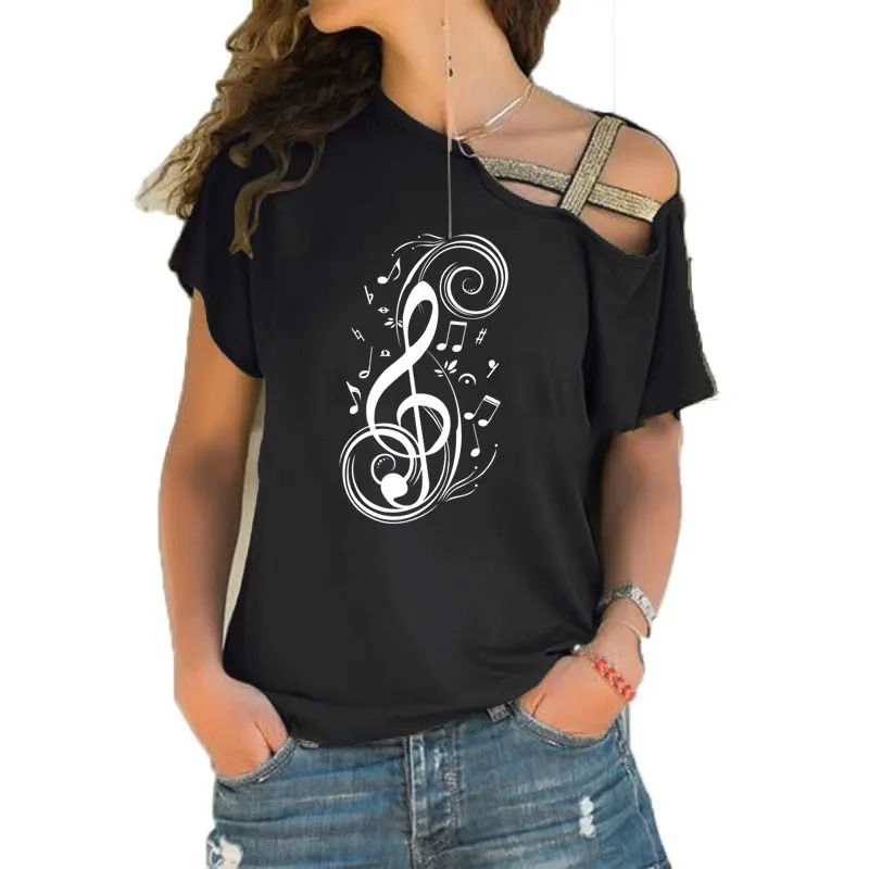 Женская футболка с принтом музыкальных нот, новая модная футболка для музыки, хлопковая Футболка с асимметричным скошенным перекрестным поясом, топы