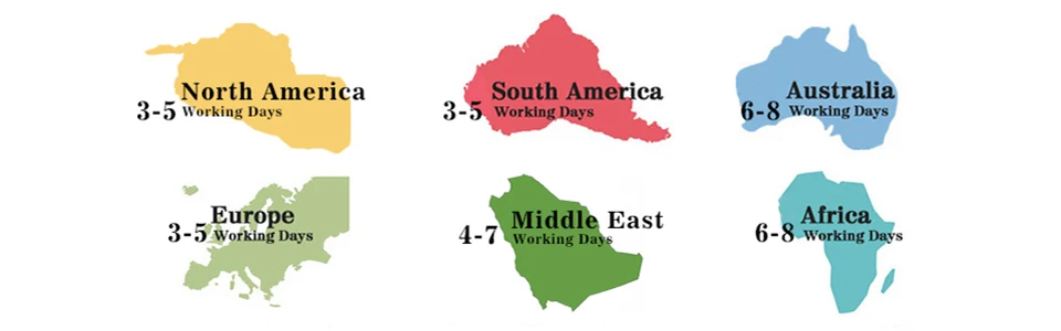 Как правило, мы отправляем ваш заказ в течение 12 часов (за исключением праздников и выходных дней 0), время доставки в разные районы указано ниже, для получения дополнительной информации, пожалуйста, свяжитесь с нами для получения дополнительной помощи!