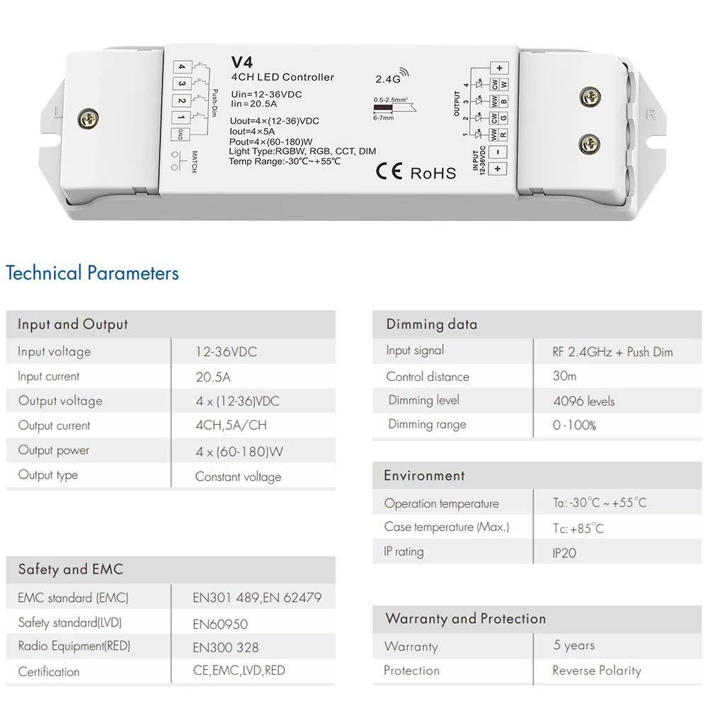 ХарактеристикиRGBW/RGB/CCT/Dimming 4 Channel LED Controller