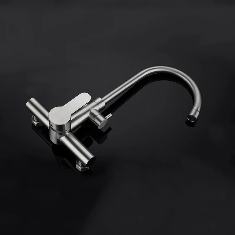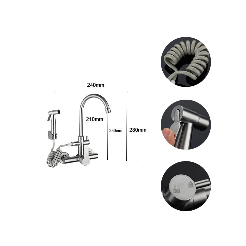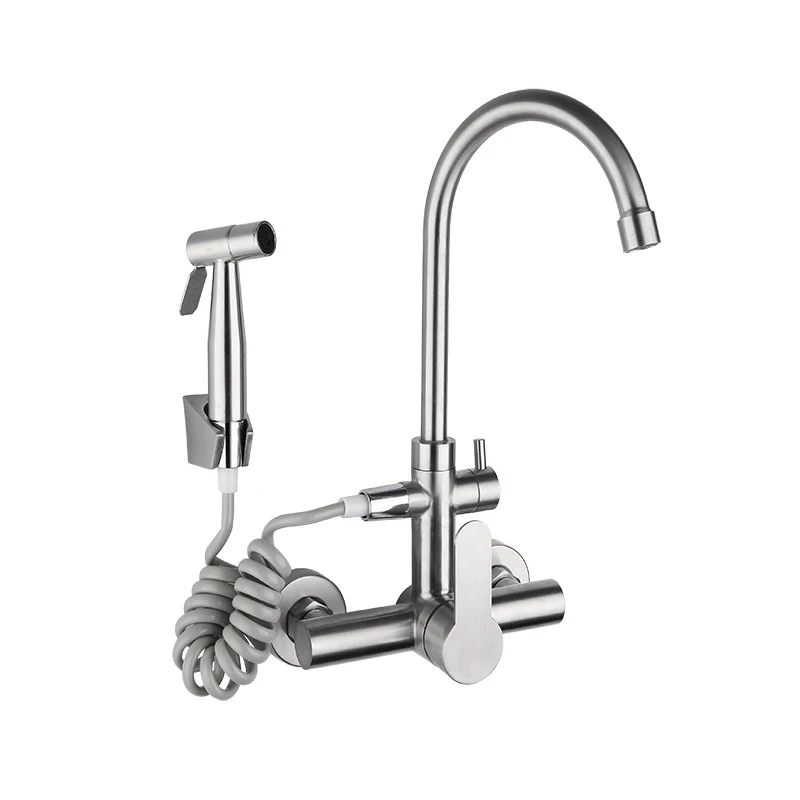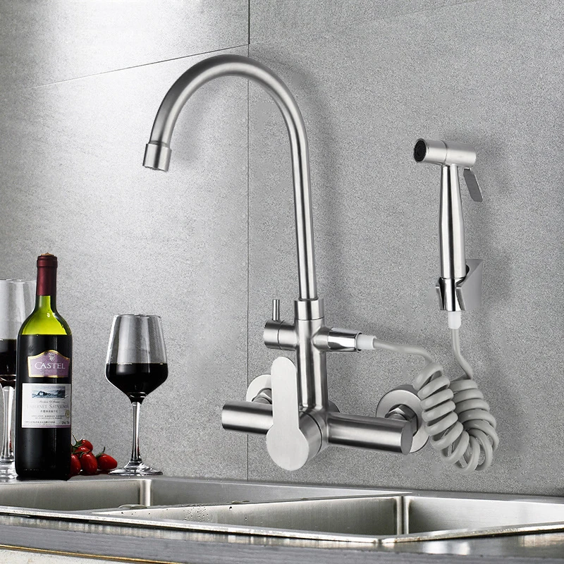 Кухонный смеситель с настенным креплением, поворотный на 360 градусов кран из нержавеющей стали для раковины с двойным отверстием и распылителем для биде, насадка для душа, смеситель для холодной и горячей воды