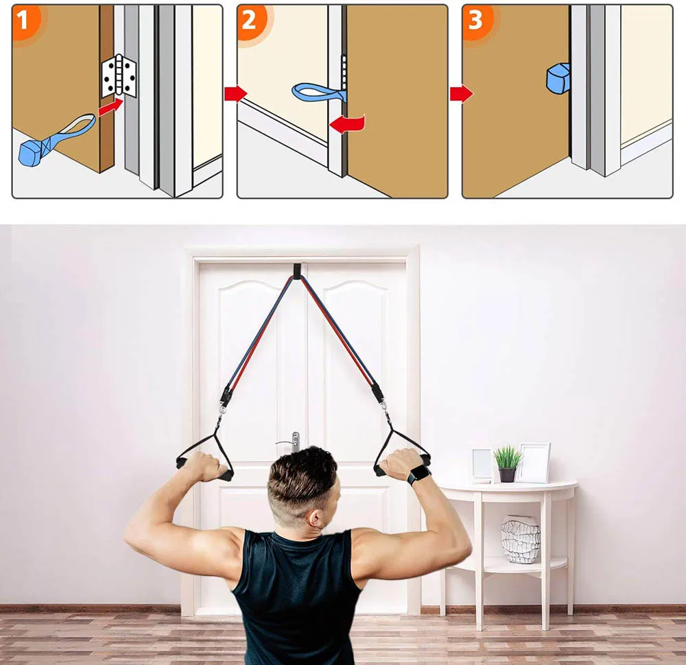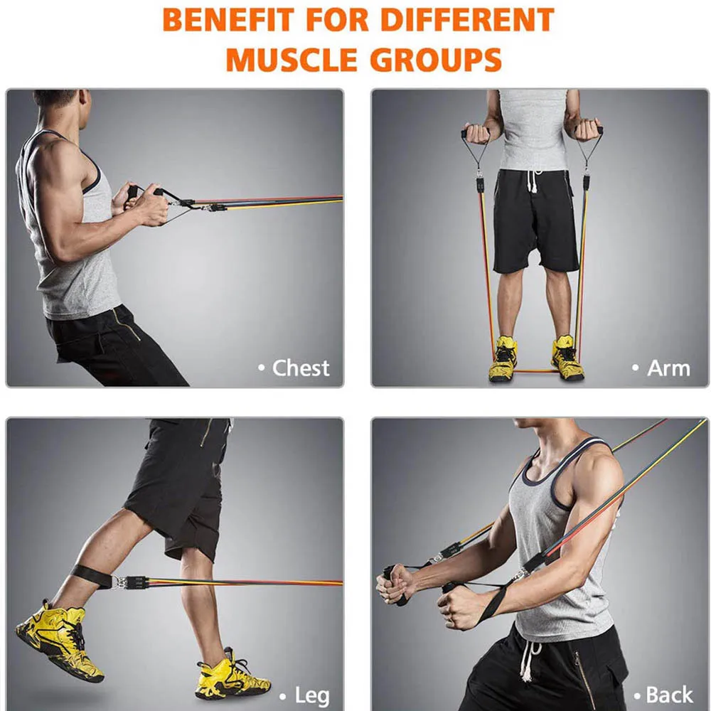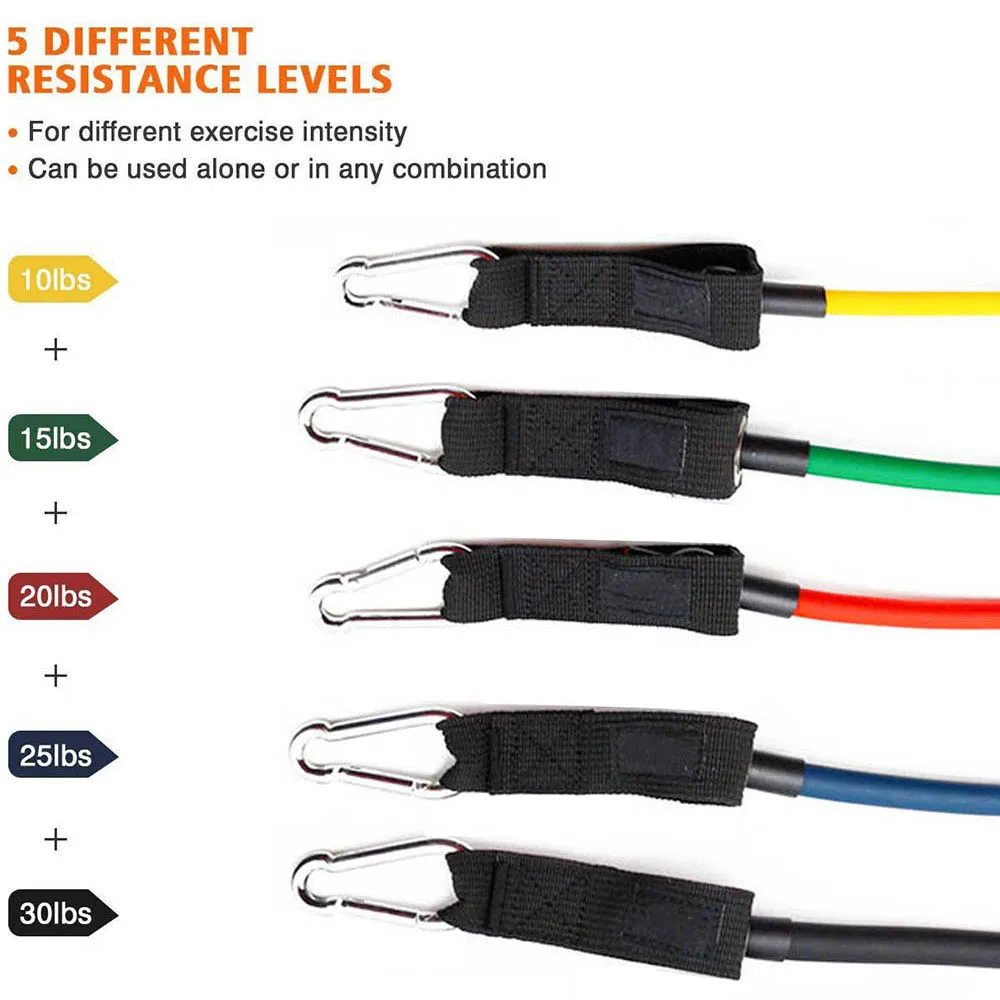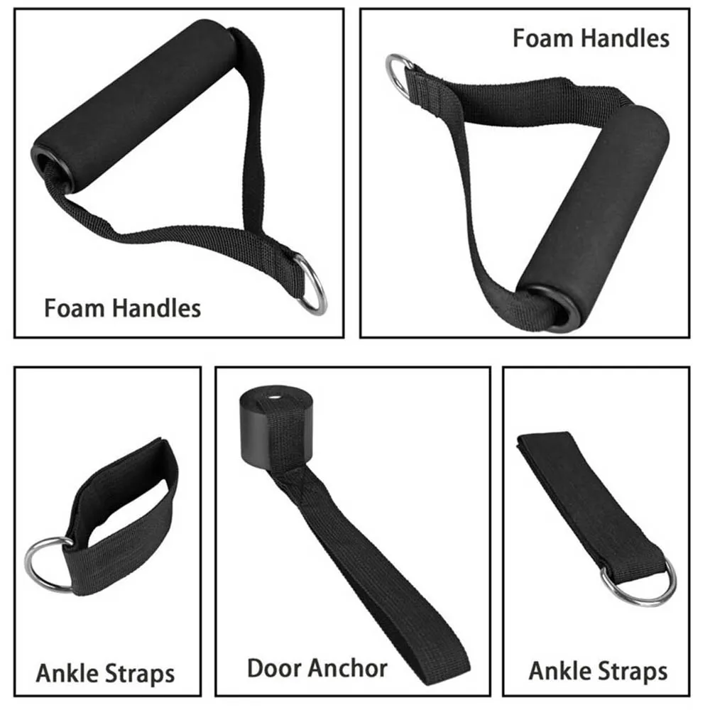 5 резинок сопротивления 2 ручки из пены 2 ремешки на лодыжке 1 якорь для двери 1 чехол для переноски 1 руководство по тренировкам