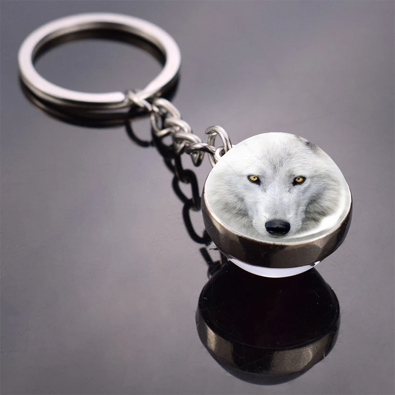 Белый брелок с волком, голова волка, стеклянный шар, брелок с двойным боковым кабошоном, стеклянный подвесной брелок, брелок с животным, Прямая поставка