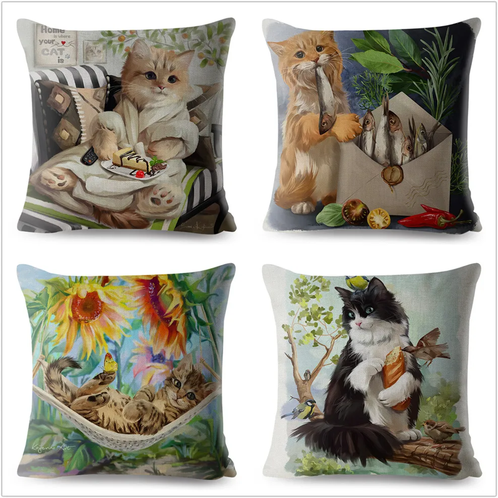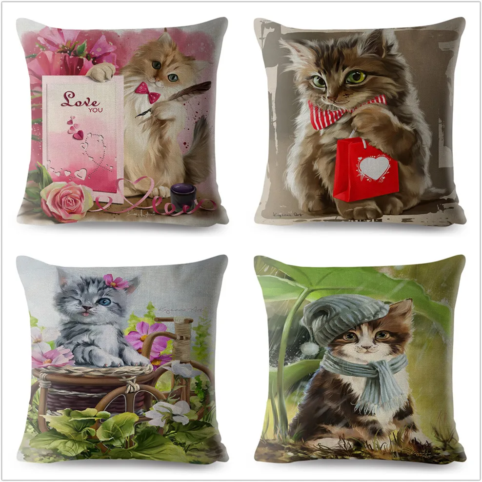 Льняные наволочки для подушек, с изображением акварельных котов, 45*45 см, чехол для подушки с принтом