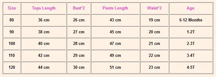 Размеры Длина топа Бюст * 2 Длина брюк Талия * 2 Возраст 80 36 см 26 см 43 см 19 см 6-12 месяцев 90 38 см 27 см 45 см 20 см От 1 до 2 лет 100 40 см 28 см 47 см 21 см От 2 до 3 лет 110 42 см 29 см 49 см 22 см От 3 до 4 лет 120 44 см 30 см 51 см 23 см От 4 до 5 летСуществует разница в 2–3 см связанная с измерением вручную. Прежде чем купить эту товарную позицию, просим тщательно свериться с таблицей размеров. 1 дюйм = 2,54 см Обратите внимание что небольшая разница в цвете считается приемлемой. Это может быть связано с положением источника света и с настройками экрана.