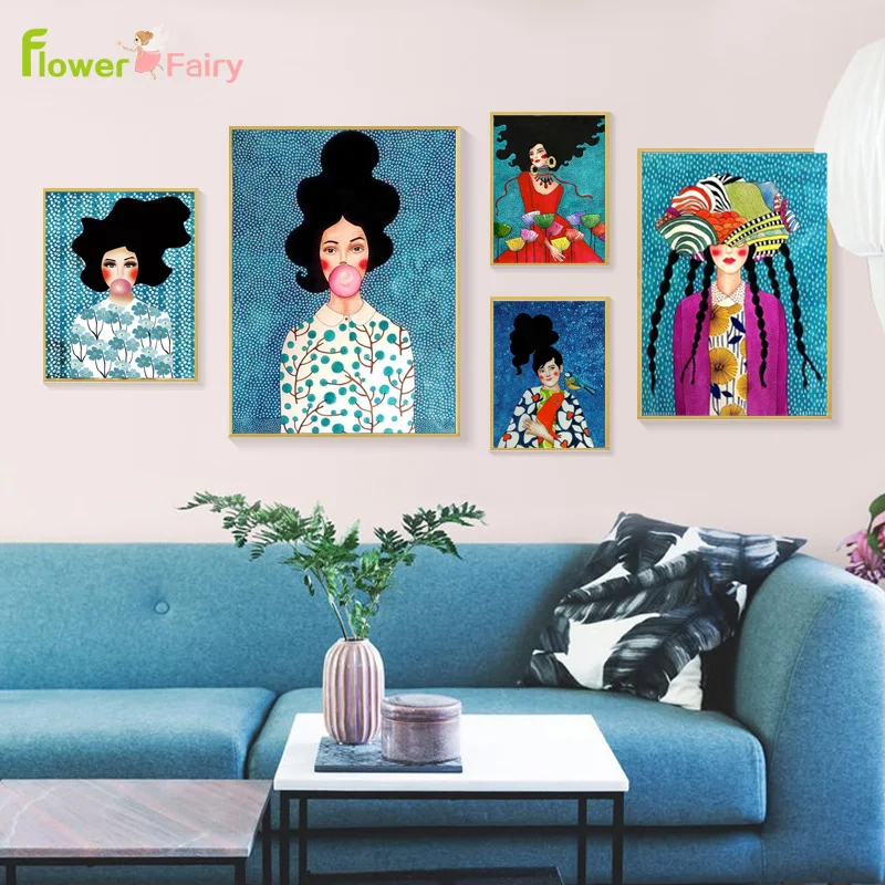 Красочные волосы девушка цветок современная женщина настенная Карти...