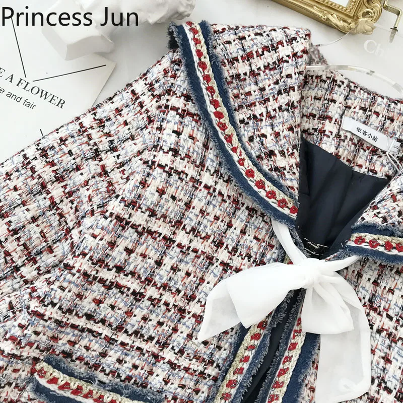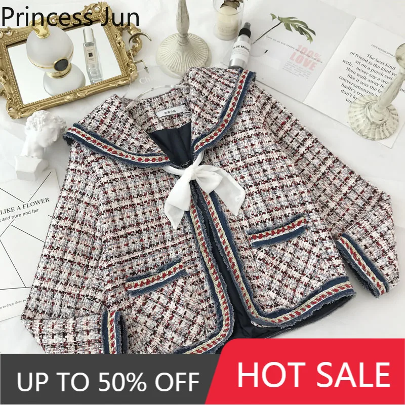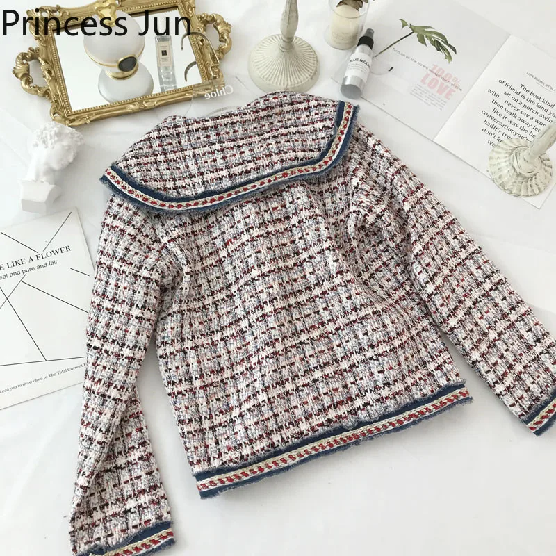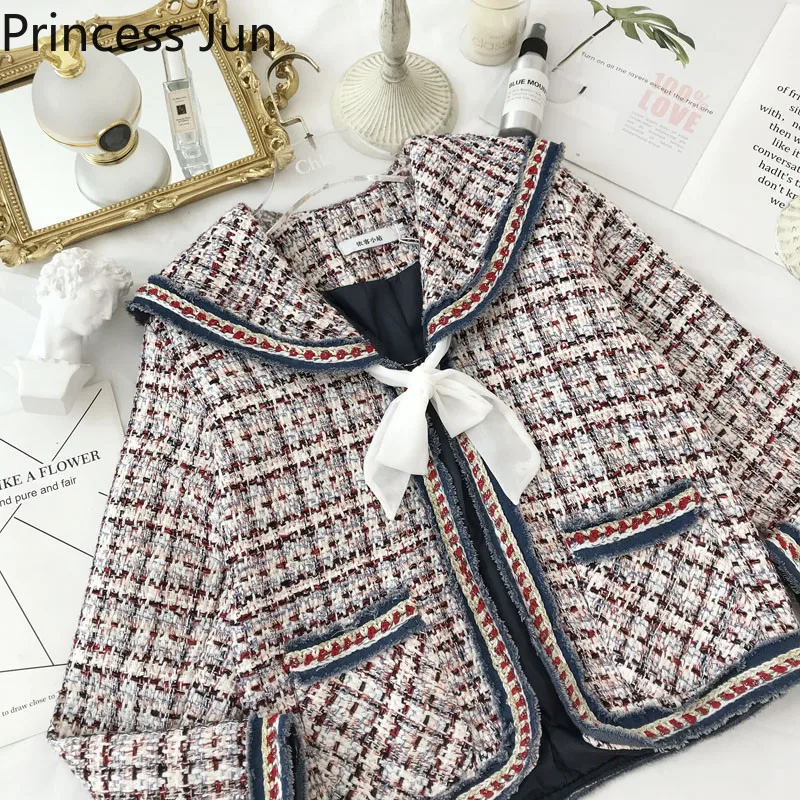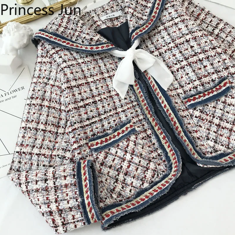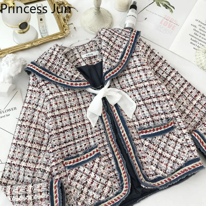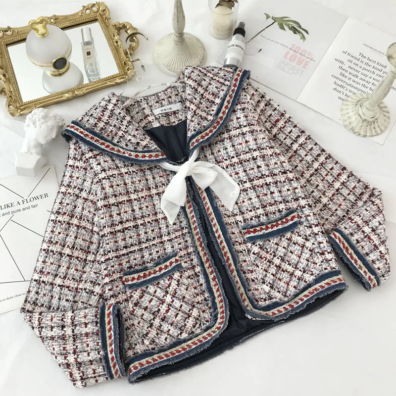 Женская короткая куртка в клетку, винтажный кардиган в стиле ретро из хлопка с матросским воротником и бантом, осенняя верхняя одежда