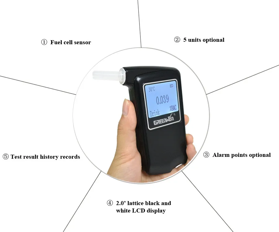 Основные функции и будущее: 1. С высокой точностью, высокой чувствительностью датчик топливных элементов, который обеспечивает стабильную производительность и тестирование точно.2.2.0 'решетка черно-белый ЖК-дисплей, широкий диапазон рабочих температур3. Храните 10 тестовых записей4. Отображение времени тестирования5. Две точки сигнализации для опции: питье, пьянство6,5 тестовых единиц (% BAC, ‰BA C, мг/л)7. Низкий уровень заряда батареи и автоматическое отключение питанияАксессуарыПеред использованием проверьте все аксессуары в упаковочной коробке.1. Алкоголь тестер2. Мундштук (10 шт.)3. Руководство пользователя4. Сумка