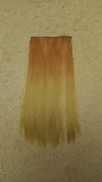 волосы тяжёлые. концы рыжие как кукольные волосы. ненатуральный цвет и блеск. смотрится уместно в заплетенной косе вперемежку со своими волосами