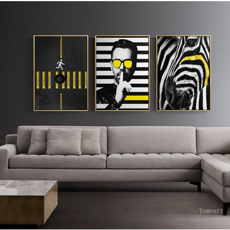 Современный человек и постер с зеброй, Настенная картина, холст, модная картина, желтый, в скандинавском стиле, декоративная картина для декора гостиной