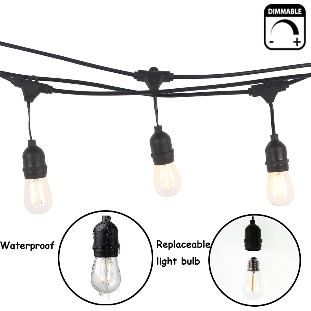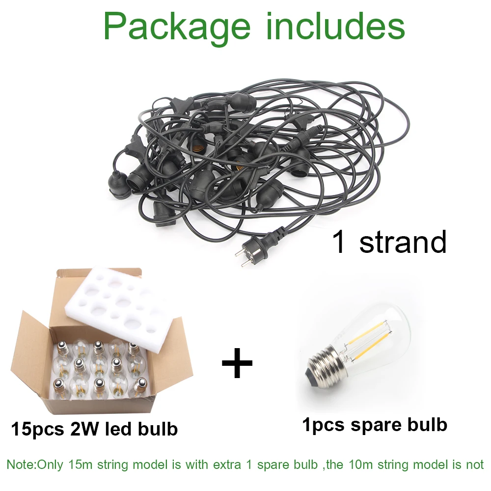 Размер лампы: 4,5x8,8 смПространство между двумя лампами: 92 смДлина от штекера до первой лампы: 1,4 мЦвет излучения: теплый белыйОбщая длина: 10 м/15 мМощность одной лампы: 2 ВтКол-во лампы: 10 лампочек/15 лампочекКласс IP: 65Цвет кабеля: черныйМатериал лампы: стеклоМатериал кабеля: резина (может использоваться при дожде, снегу и холодной температуре)Диаметр кабеля: 0,75-0,85 квадратных метровПодключение: ДаШтепсельная Вилка: штепсельная вилка стандарта Великобритании/штепсельная вилка стандарта США/штепсельная вилка стандарта Австралии/штепсельная вилка европейского стандартаCE ,UL,RoHS для внутреннего/наружного использованияВы можете подключить 6 шт. струнных ламп вместе (всего 100 м или 100 ламп вместе)